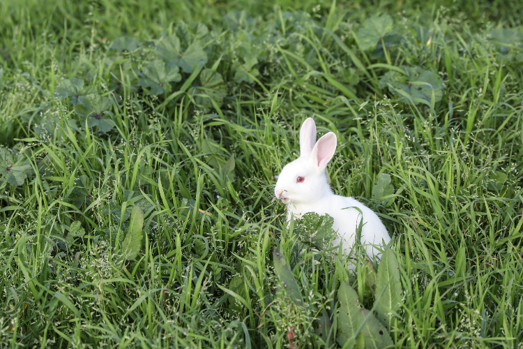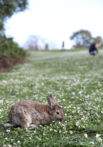 公园内一只吃草的兔子。