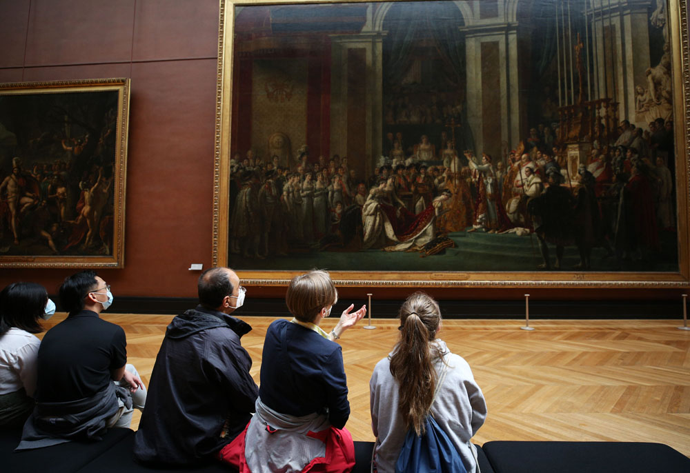2020年7月6日,参观者在法国巴黎卢浮宫博物馆欣赏画作《拿破仑加冕》。(图片来源:新华社)