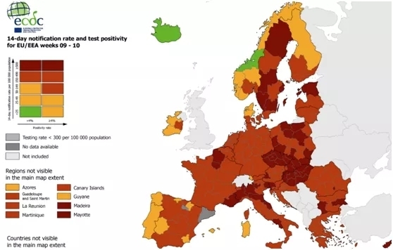 此外,欧洲疾控中心今天更新了疫情地图,其中意大利皮埃蒙特、伦巴第、艾米利亚-罗马涅、马尔凯、弗留利-威尼斯朱利亚、坎帕尼亚、特伦托自治省均为“深红区”。