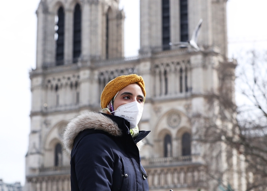 3月17日,一名戴口罩的女子走过修复中的法国巴黎圣母院。(图片来源:新华社)