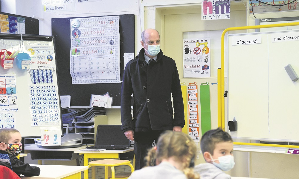 3月22日,法国教育部长布朗盖视察北部La Ferte-Milon的一座小学。当前法国疫情严重,但学校仍在坚持上课。(法新社图)
