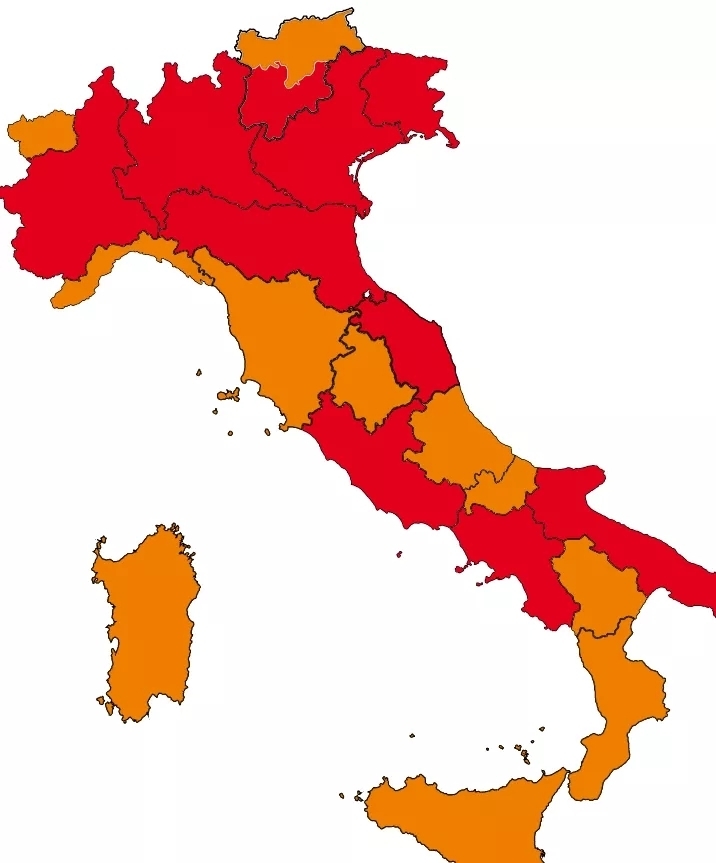 10个“红区”:坎帕尼亚、艾米利亚-罗马涅、弗留利-威尼斯朱利亚、拉齐奥、伦巴第、马尔凯、皮埃蒙特、普利亚、威尼托、特伦托自治省。