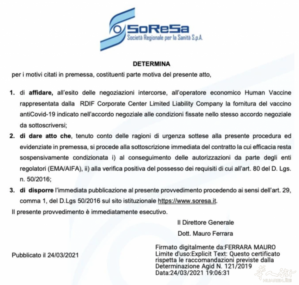 但根据意大利及欧盟法律规定,购买疫苗的款型都需经过意大利药监局(Aifa)和欧洲药品管理局(Ema)批准,否则合同形同废纸。