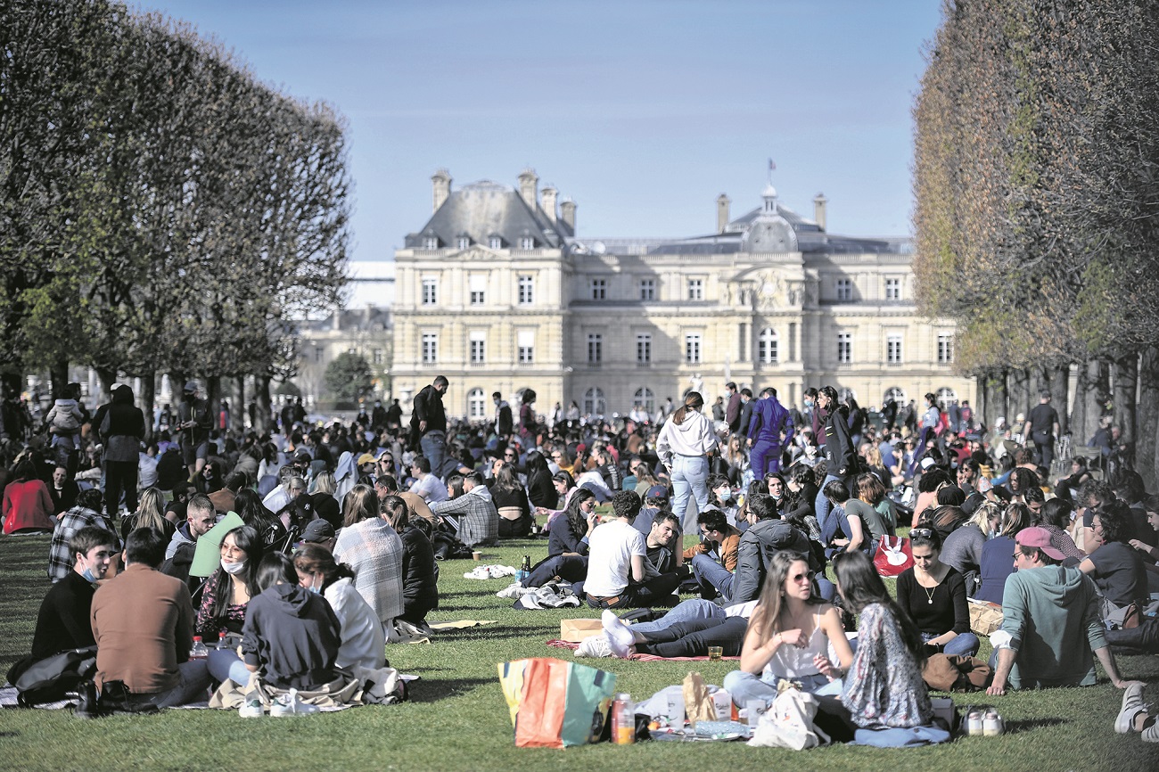 3月28日,巴黎卢森堡公园“热闹非凡”。人们接受卫生当局“多到户外活动”的建议,享受严重疫情下的短暂春光。此外,法国各地当日共有187场以气候变化为主题的集会和游行示威。(法新社图)
