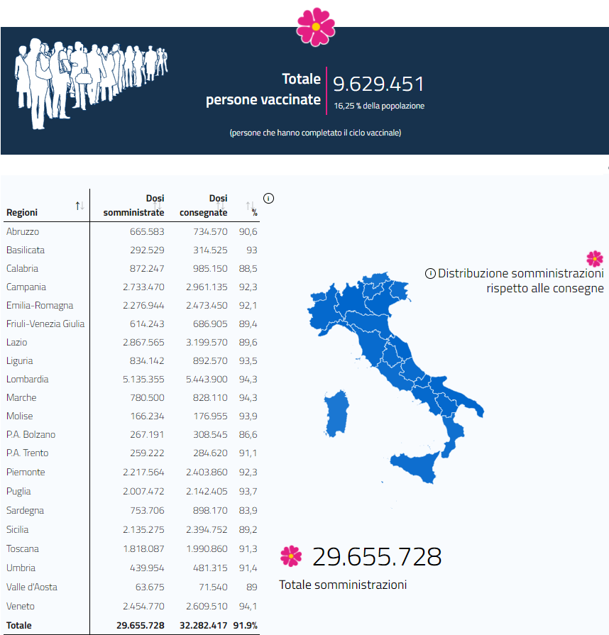 截至今日下午17时,意大利已有962.9万人完成两剂疫苗注射,占总人口16.25%。
