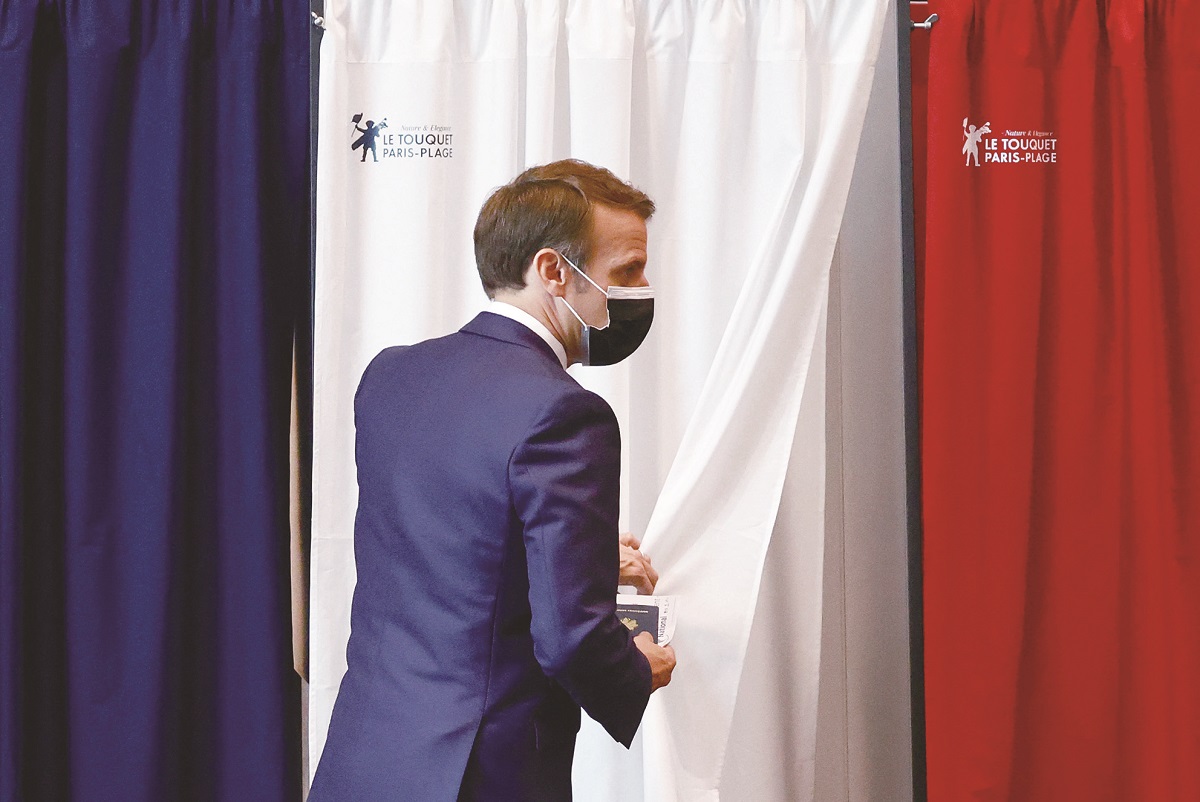 法国总统马克龙20日参加大区选举首轮投票。(法新社图)