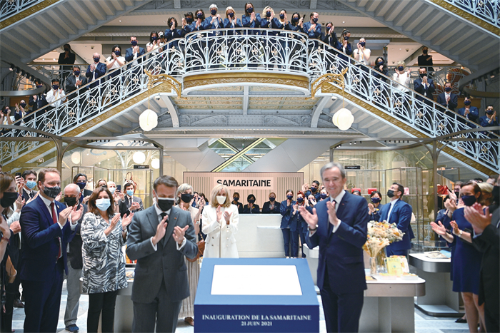 【欧洲时报来米编译】法新社报道,马克龙总统6月21日在LVMH集团总裁阿尔诺(Bernard Arnault)身边出席了莎玛丽丹百货(La Samaritaine)的开幕典礼。