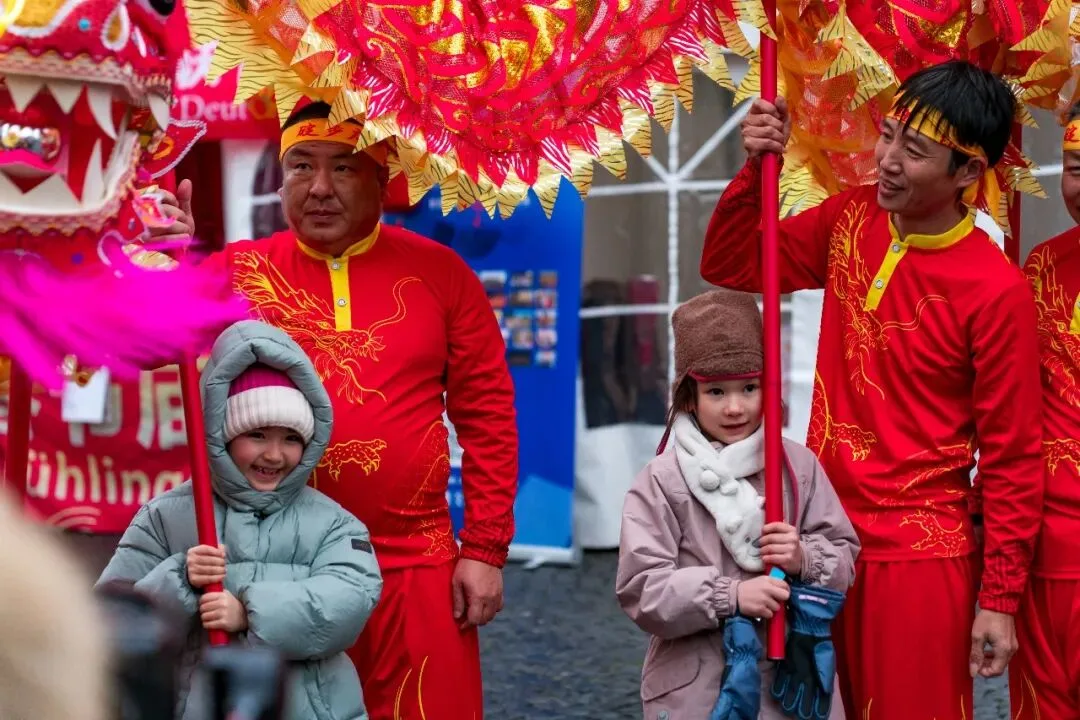 当碇步龙舞龙队登场,铿锵鼓乐骤然响起,队员们身着盛装、默契配合,模仿碇步之上的腾跃翻转,龙身时而盘旋起伏,时而蜿蜒游走,灵动的姿态仿佛将浙南山水的灵秀带到了莱茵河畔。德国友人们纷纷驻足围观,不少人拿出手机、相机拍摄,满是好奇与赞叹。