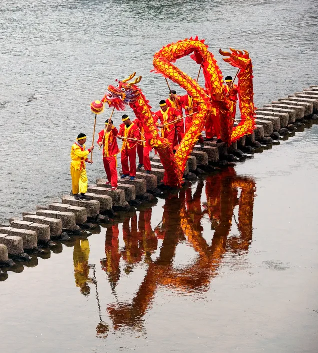 作为流传于泰顺仕阳镇的独特民俗,碇步龙有着两百余年的悠久历史,于2011年被正式列为国家级非物质文化遗产代表性项目,被誉为“浙南山区文化的活化石”。仕水碇步作为国家级文物保护单位,全长144米、共233齿,舞龙者在狭窄的碇步上腾跃翻飞,龙影倒映水面,构成一幅灵动的民俗画卷,其表演融合武术、舞蹈与民俗风情,独具东方韵味。