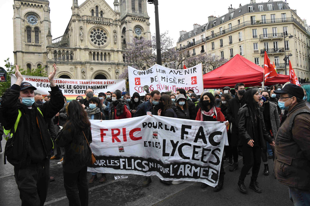 【欧洲时报靖树编译】5月1日劳动节的法国街头,不乏杂货店、面包店和超市门口售卖铃兰花的临时摊位,当然也少不了游行队伍。在新冠危机背景下,今年的五一大游行尤其引人关注。当天,法国多家工会组织近300项大游行,遍布全法各大城市,游行主题是“改善就业、工资、公共服务、社会保护、自由与和平”等权益。