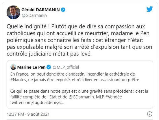 法国极右翼“国民联盟”党魁玛琳娜·勒庞(Marine Le Pen)发推特表示:“在法国,一个非法移民可以火烧南特大教堂,却不会被驱逐出境,而且还能再杀害一名神父”,并斥责这是“国家和达尔马宁的彻底失败”。