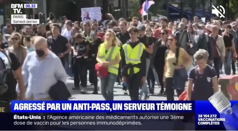本周一,在法国滨海夏朗特省(Charente-Maritime)圣特斯(Saintes)一家酒吧,一名男子不仅拒绝出示健康证,反而怒打服务员。