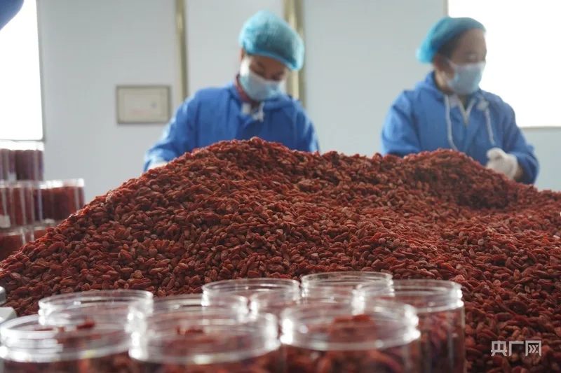 企业生产车间内,鲜红的枸杞正在打包装箱(央广网记者 汪晓青 摄)