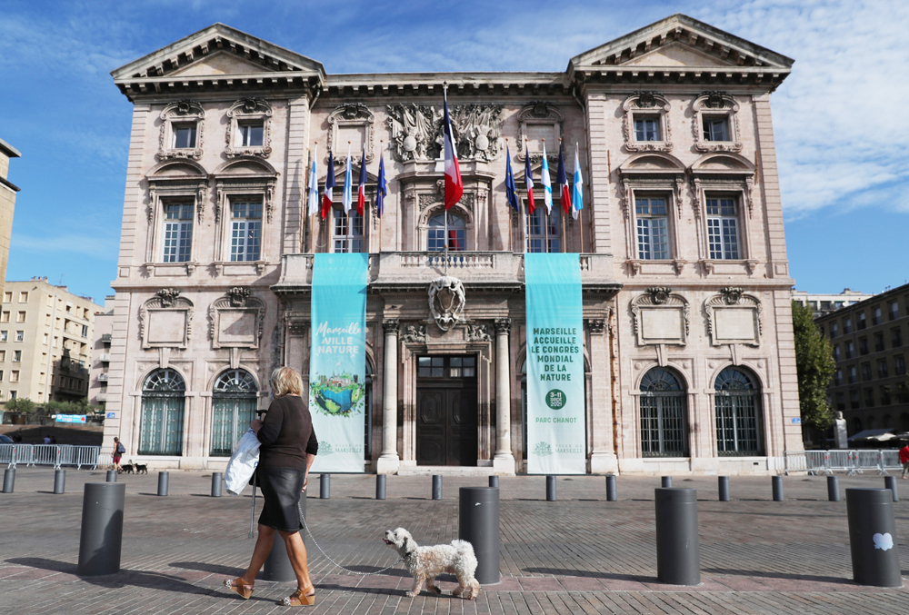 9月4日,一名女子在法国马赛市政厅前遛狗。(图片来源:新华社)