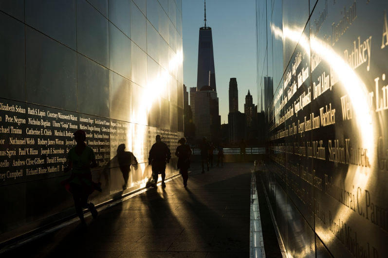 9月11日,在美国新泽西州泽西城的自由州立公园,人们走过“空旷的天空”纪念碑。(图片来源:新华社)