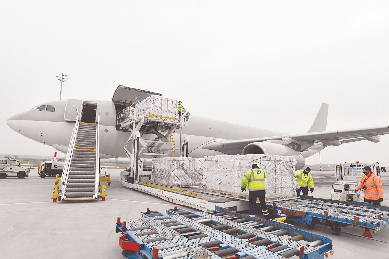 图为2021年2月16日,匈牙利从中国进口的国药Sinopharm疫苗抵达布达佩斯李斯特·费伦茨国际机场。(法新社图)