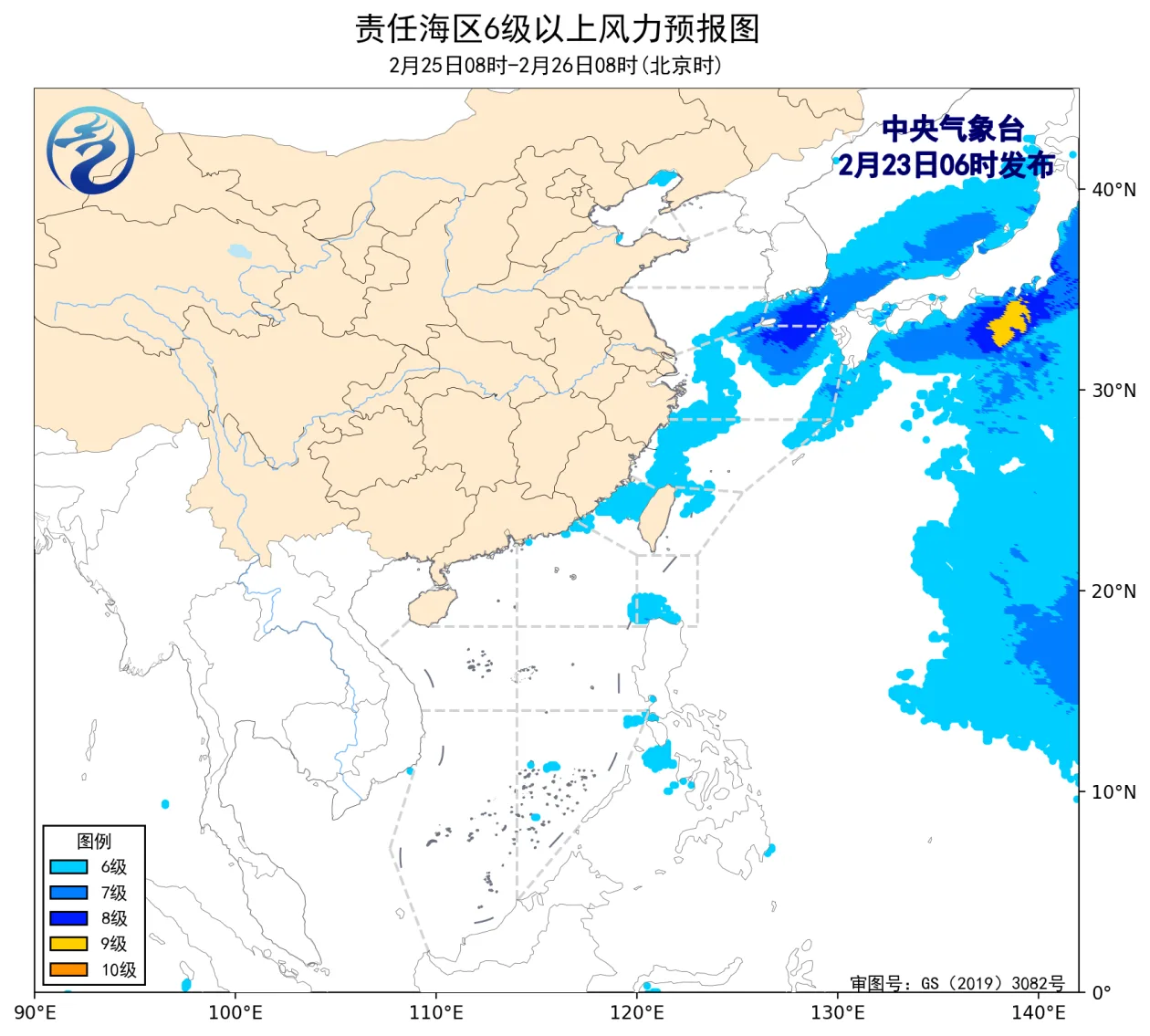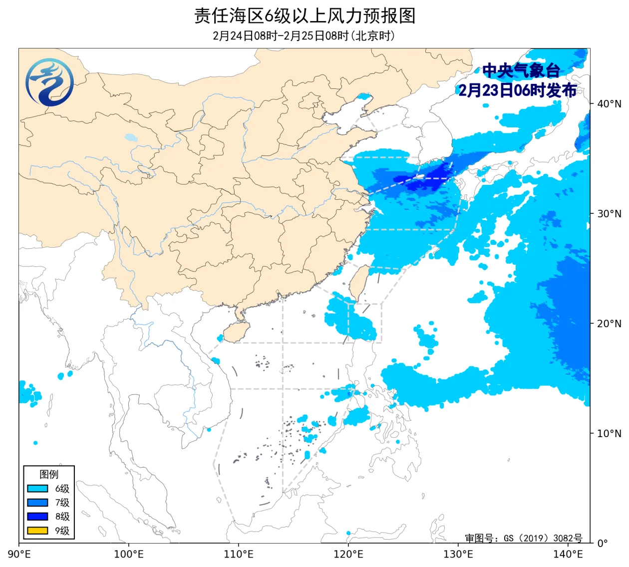 2月22日14时至23日02时,渤海出现了5~6级、阵风7级的西北风,黄海大部海域、东海大部海域、台湾海峡出现了5~7级、阵风8级的东北风或偏北风。