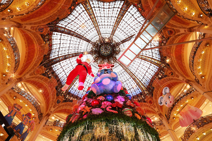 在法国巴黎老佛爷百货商场拍摄的巨型圣诞树。(图片来源:本文图片均据新华社)