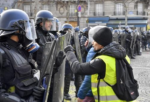 “黄马甲”示威者在法国巴黎与警方对峙。(图片来源:新华社/资料图)