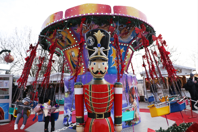 12月9日,孩子们在法国巴黎杜伊勒里花园的圣诞市场玩耍。