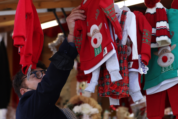 12月9日,一名男子在法国巴黎的一处圣诞市场挑选节日商品。