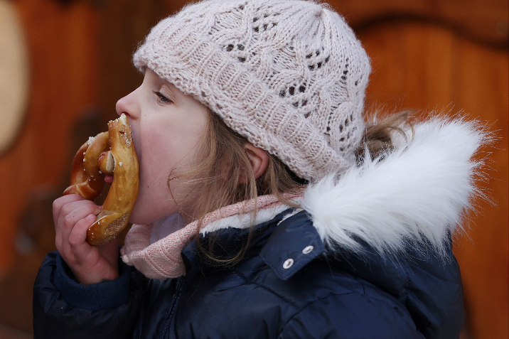 12月9日,在法国巴黎杜伊勒里花园的圣诞市场,一个女孩享受圣诞市场的经典传统美食——碱水扭结面包。