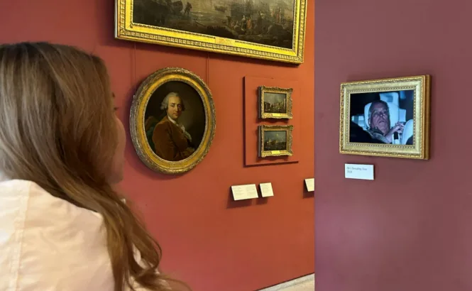 这是怎么回事?上述媒体介绍说,原来是有一群活动人士22日将这张照片挂在了卢浮宫展示墙上。现场画面显示,这张照片被装裱了起来,下方还有一句说明文字:“他现在正在流汗”。天空新闻网解释说,这句话似乎是在影射安德鲁此前在爱泼斯坦案相关指控中曾说自己“流不出汗”。