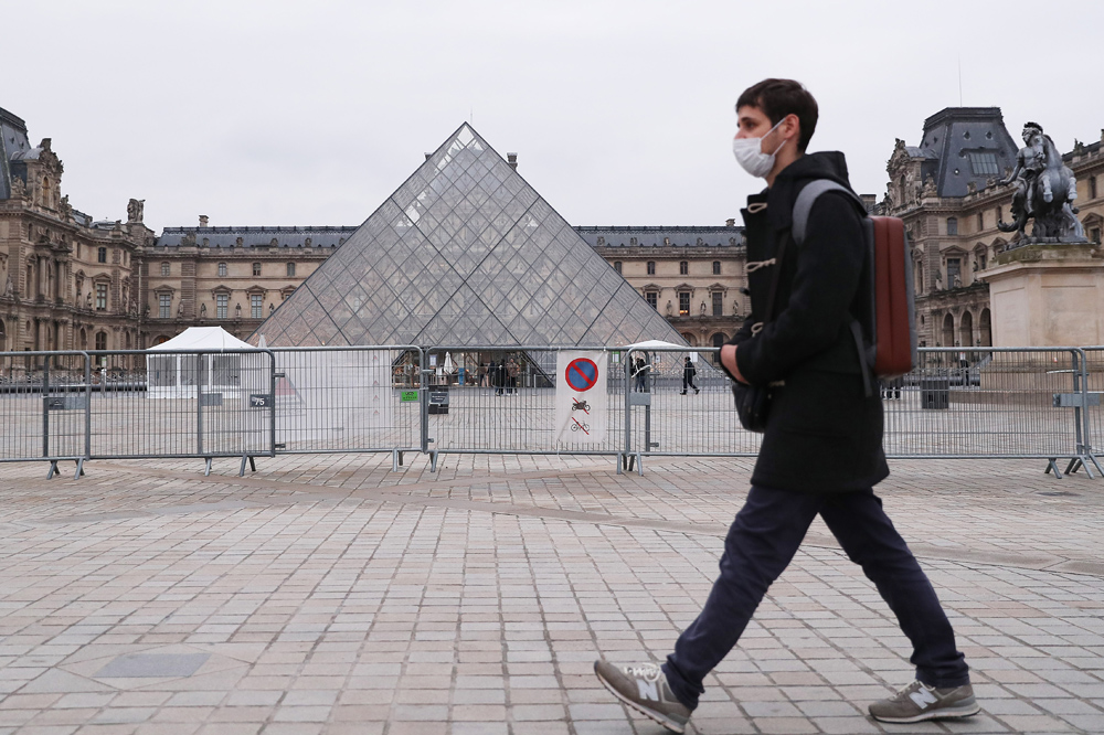 图为一名男子走过法国巴黎卢浮宫的玻璃金字塔。(图片来源:新华社)