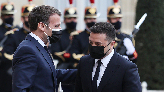 2021年4月16日,在法国巴黎总统府爱丽舍宫,法国总统马克龙(左)欢迎到访的乌克兰总统泽连斯基。(图片来源:新华社)