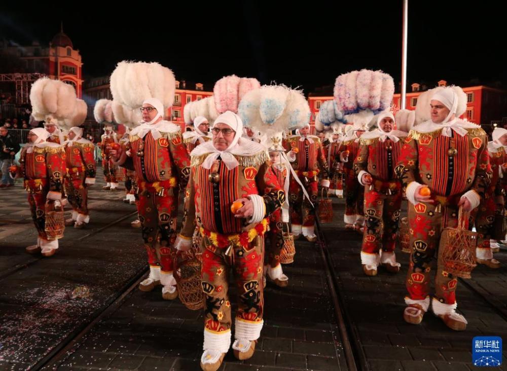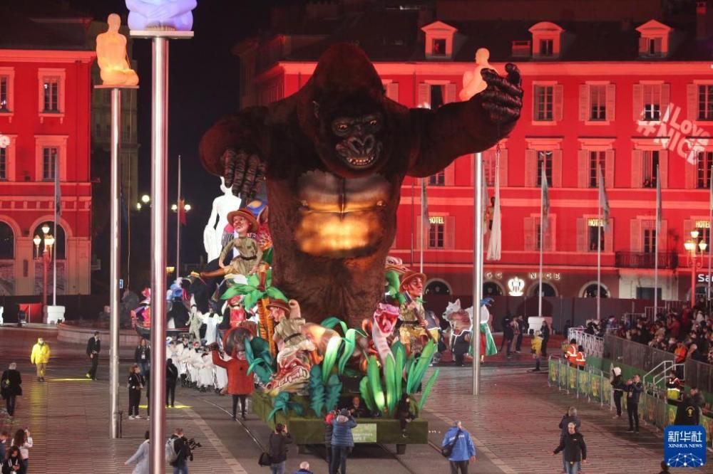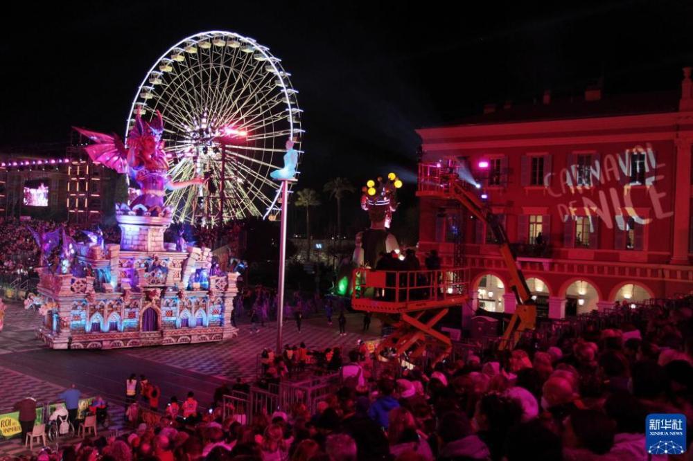 这是2月12日在法国南部城市尼斯拍摄的狂欢节花车夜间游行现场。
