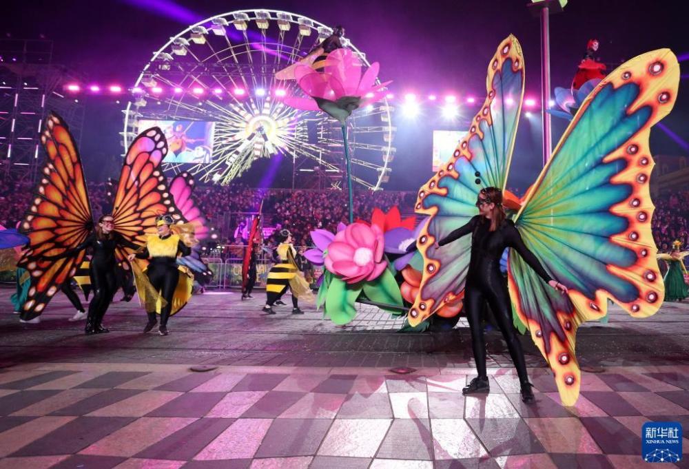 这是2月12日在法国南部城市尼斯拍摄的狂欢节花车夜间游行现场。(图片来源:本文图片均自新华社)