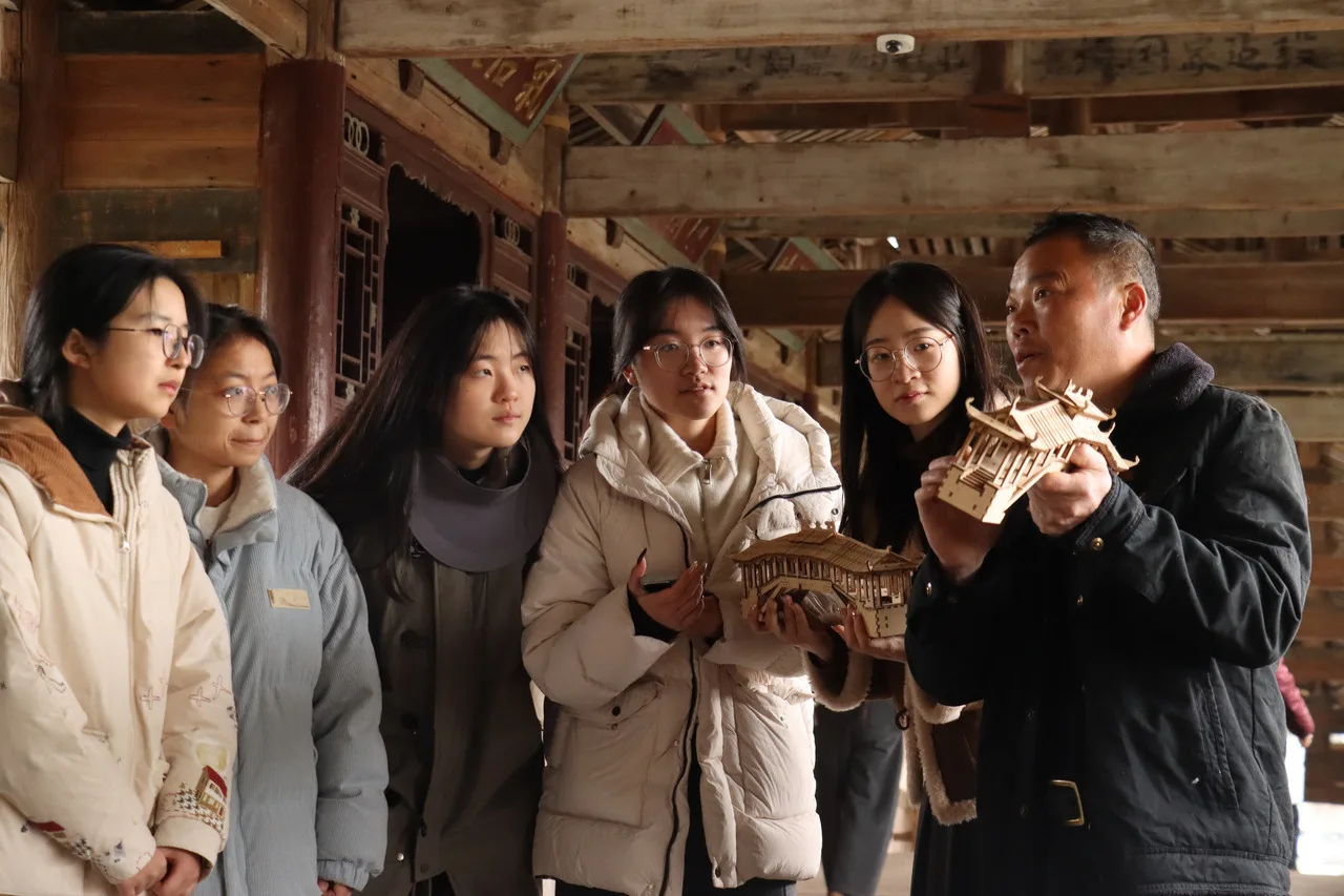 来到桥上,曾家快驻足深入讲解:“廊桥建造过程中没用一钉一铆,桥中间也不用桥柱支撑。你们可以看看模型。”听到这番介绍,学生们开始围观我们手里的模型,身边不少游客也停下了脚步。
