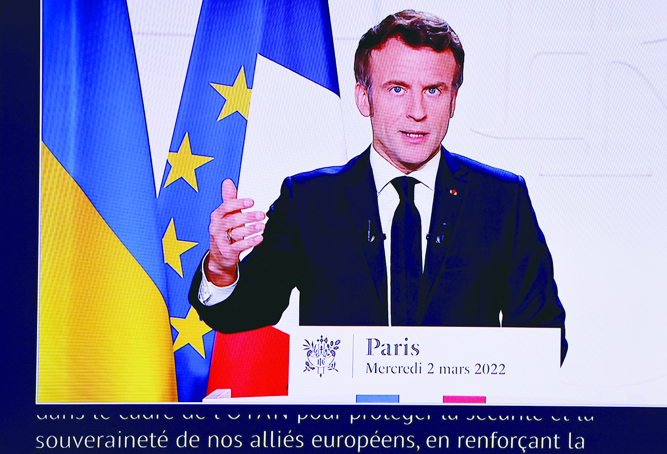 3月2日晚,马克龙发表电视讲话时,特别将乌克兰国旗与法国国旗和欧盟旗帜放在一起作为背景。(法新社图)