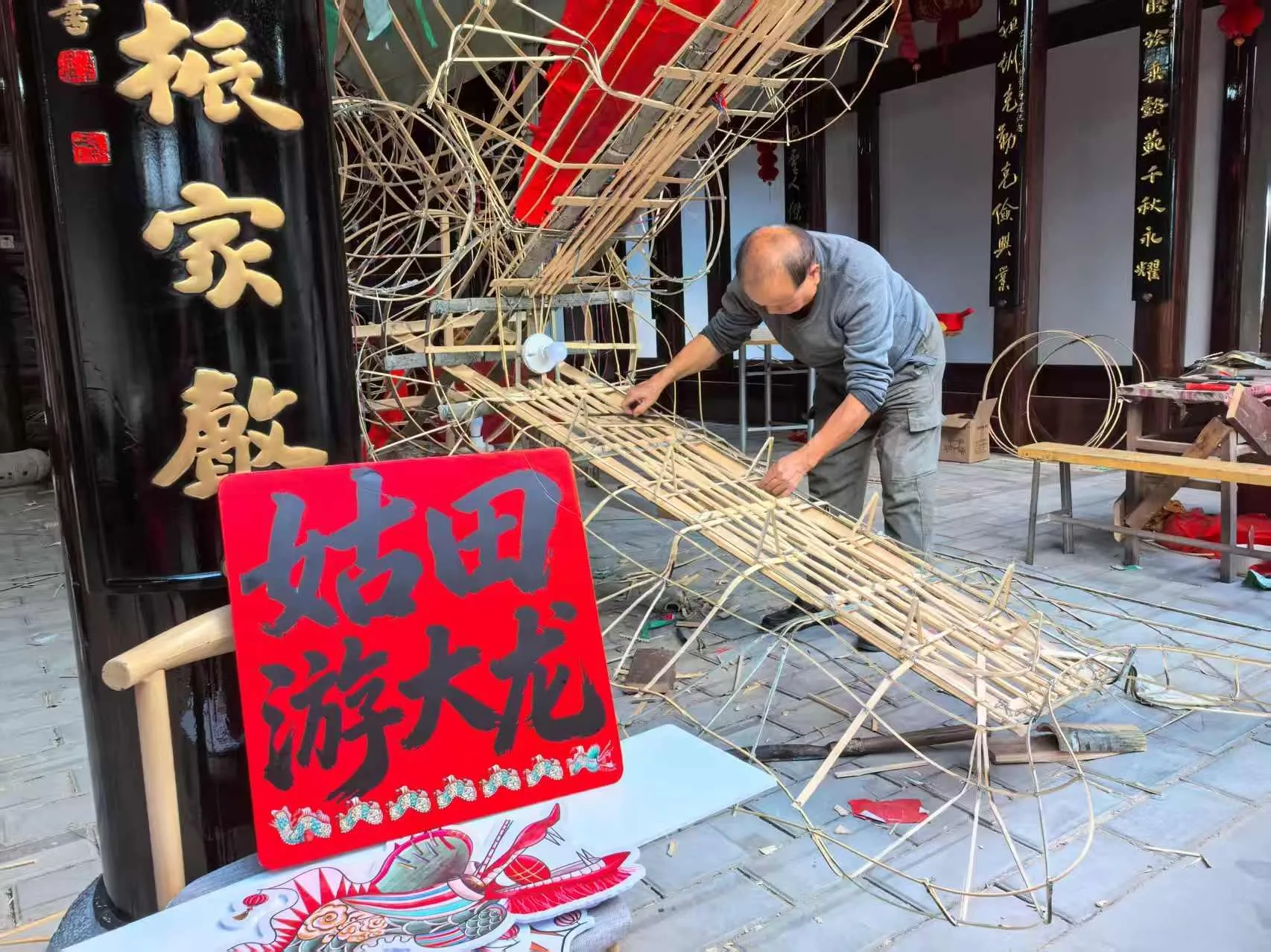 东南网2月23日讯(记者 吴静 文/图)新春年味正浓,元宵盛会将至。2月22日下午,连城县姑田镇中堡村朝相公祠内一派热火朝天的忙碌景象,非遗传承人华师傅正专注地削竹篾、扎骨架、组装龙头框架,紧锣密鼓赶制被誉为“天下第一龙”的姑田大龙,为元宵游大龙民俗活动做足准备。