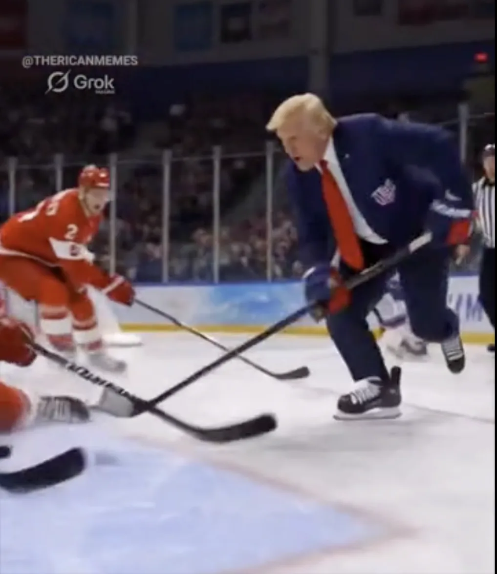 视频显示,比赛进行到一半时,特朗普脱下手套,并赤手空拳殴打加拿大运动员。比赛最后,特朗普再次进球,有外媒形容此举为“一举拿下加拿大”。