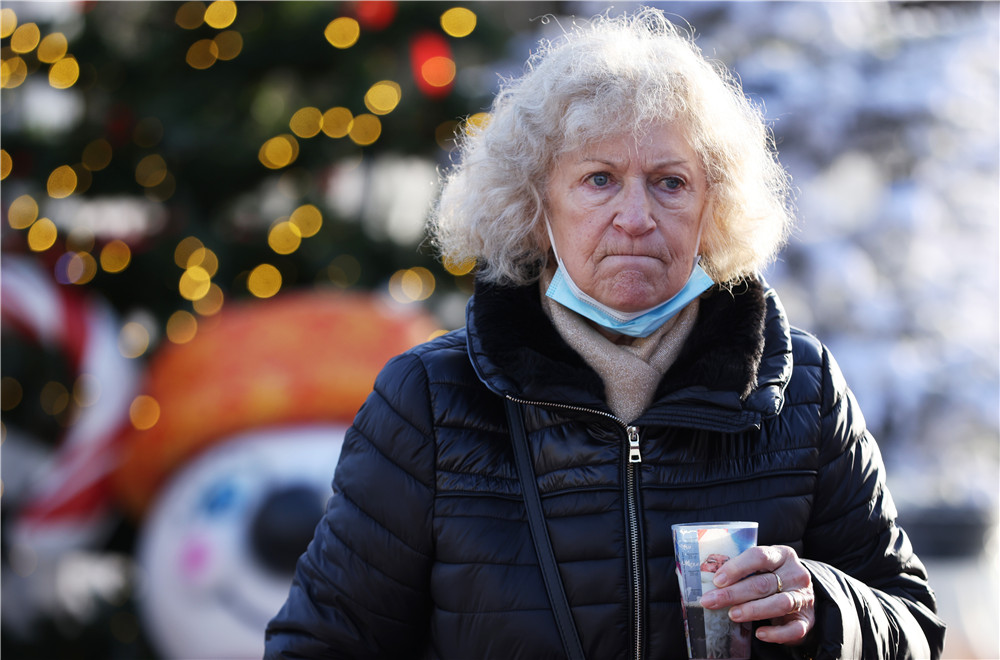 2021年12月9日,一名女子在法国巴黎一家圣诞市场边走边喝热红酒。(图片来源:新华社)