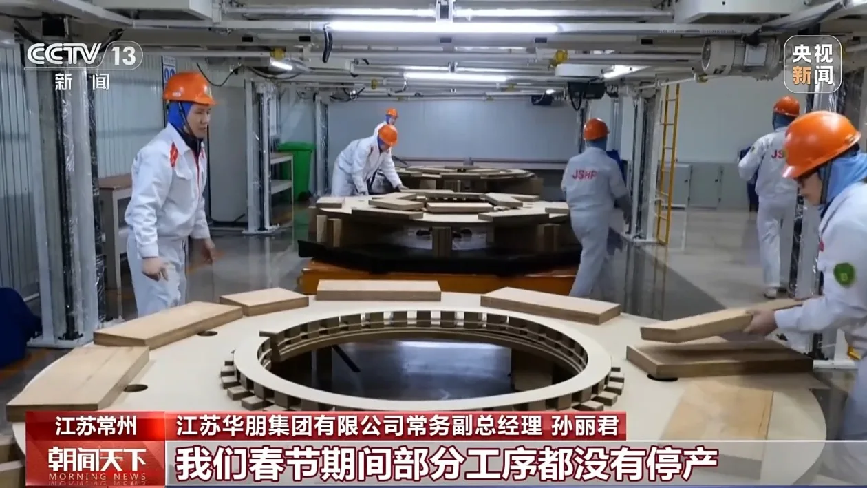 江苏华朋集团有限公司常务副总经理 孙丽君:眼下,我们在手订单已超过30亿元,其中出口订单超过20亿元,现在订单已经排到年底。为了抢抓工期,确保订单按时交付,我们春节期间部分工序都没有停产。