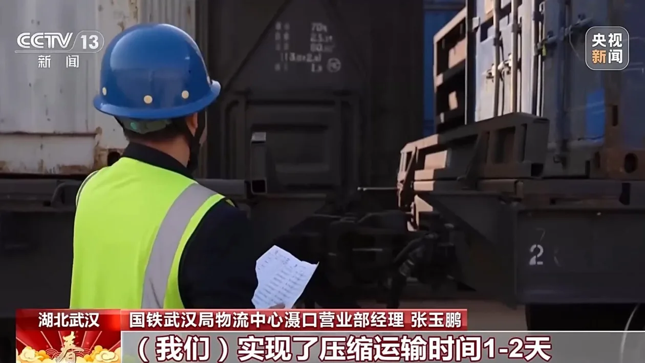 国铁武汉局物流中心滠口营业部经理 张玉鹏:现在货量明显上来了,很多企业开年第一批货都集中在这几天发运,每天发到3列左右。通过前置查验、集拼集运、双始发站联动,我们实现了压缩运输时间1-2天、降低物流成本15%。