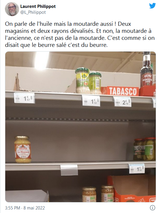 法国人展示超市货架上缺货的黄芥末酱。(图片来源:推特截图)