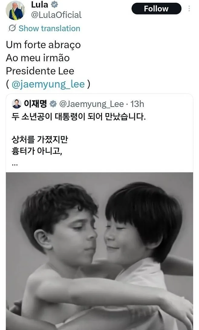 李在明在上述AI视频配文称:“两名曾是童工的少年,如今成为总统后相遇。他们身负伤痛,但那不是伤疤;在劳动中,他们领悟了生活的智慧。虽历经逆境,却被人民拯救。因此,我们是兄弟。我将这段视频献给兄弟——卢拉总统。”