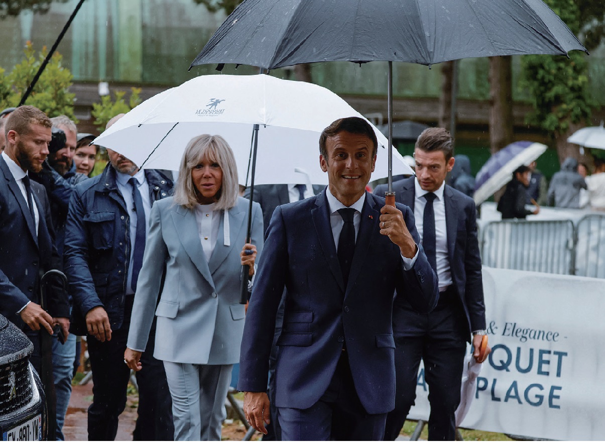 马克龙总统与夫人在参加立法选举第二轮投票后离开投票站。(法新社图)