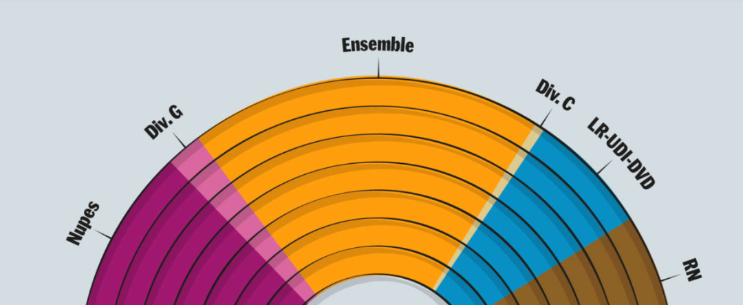 在第一轮中,Nupes和马克龙总统多数派联盟的得票率非常接近:Nupes得票率为25.59%,而Ensemble!为25.75%。