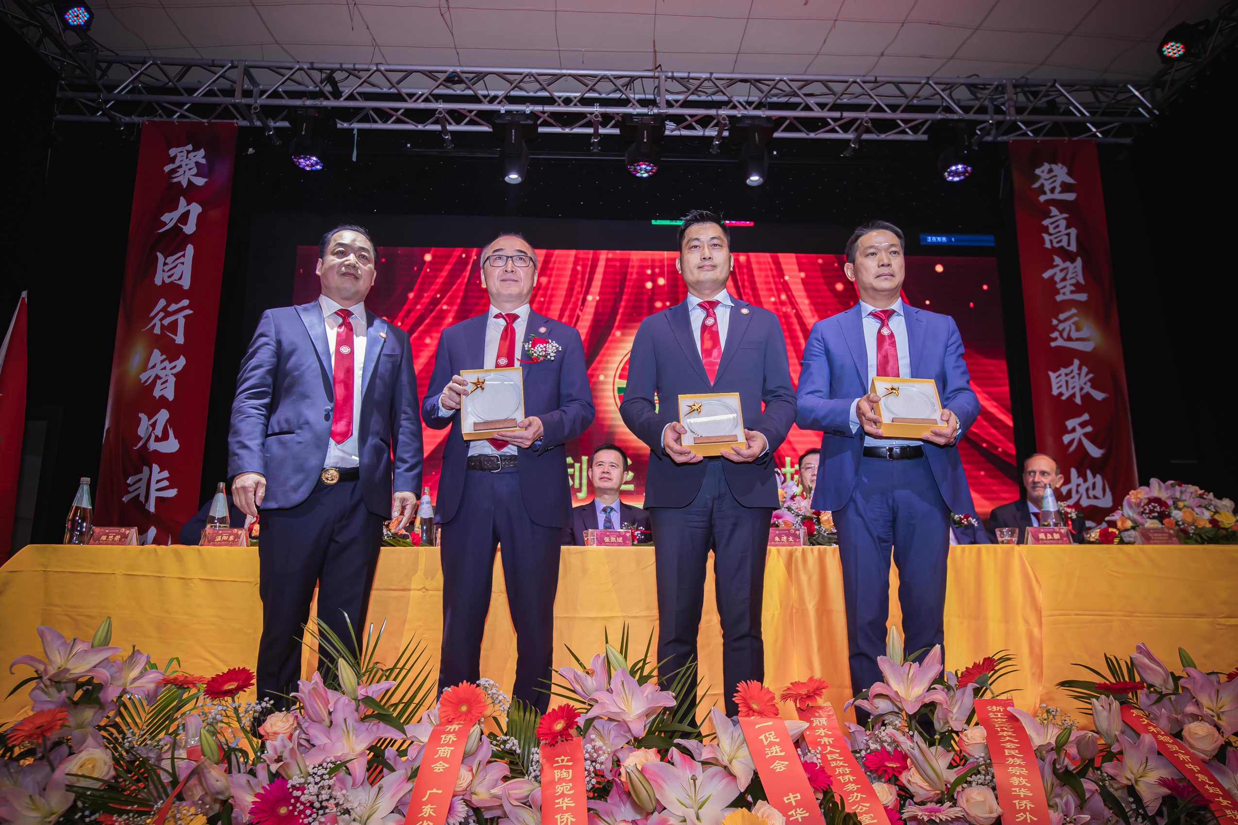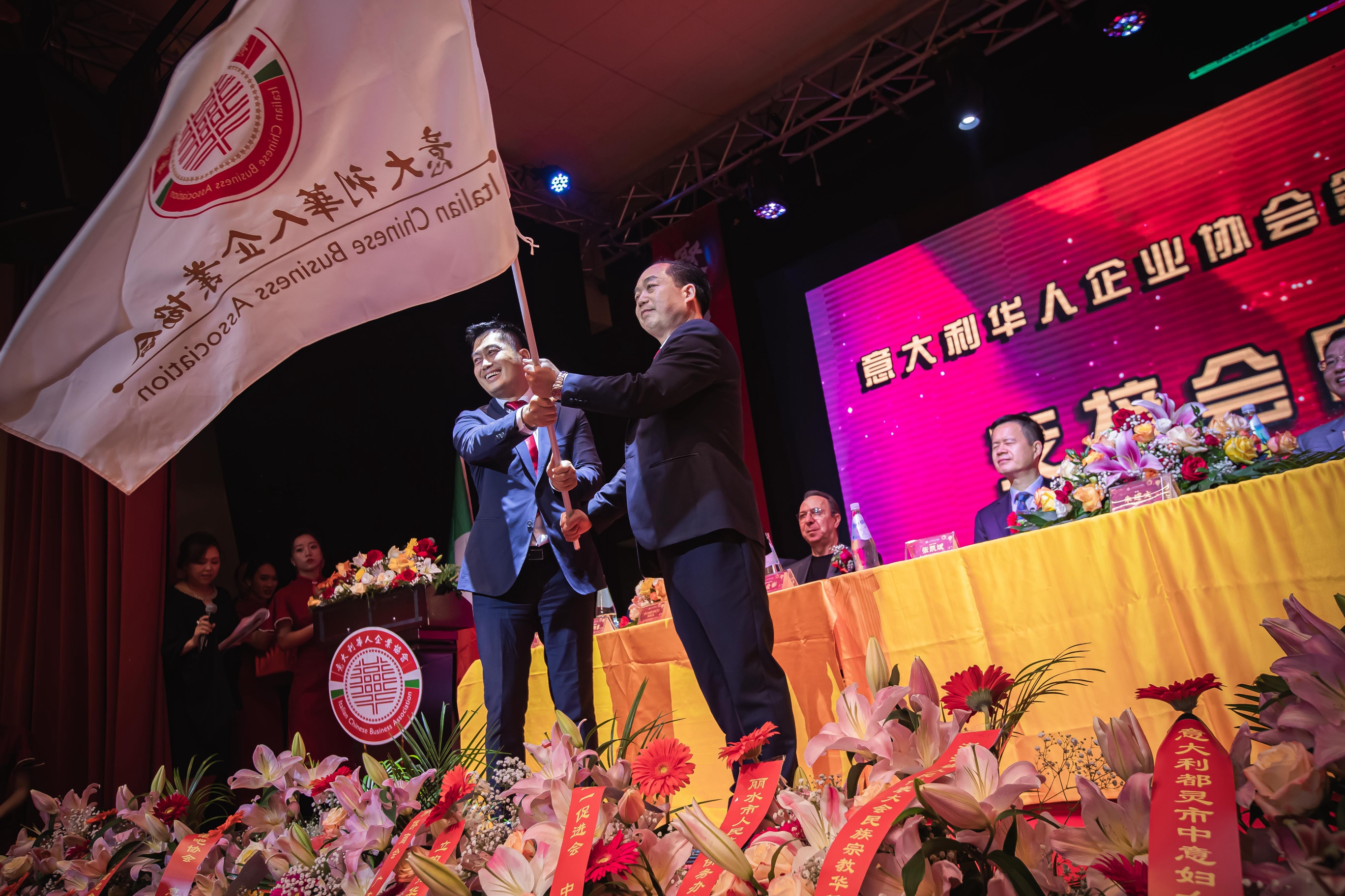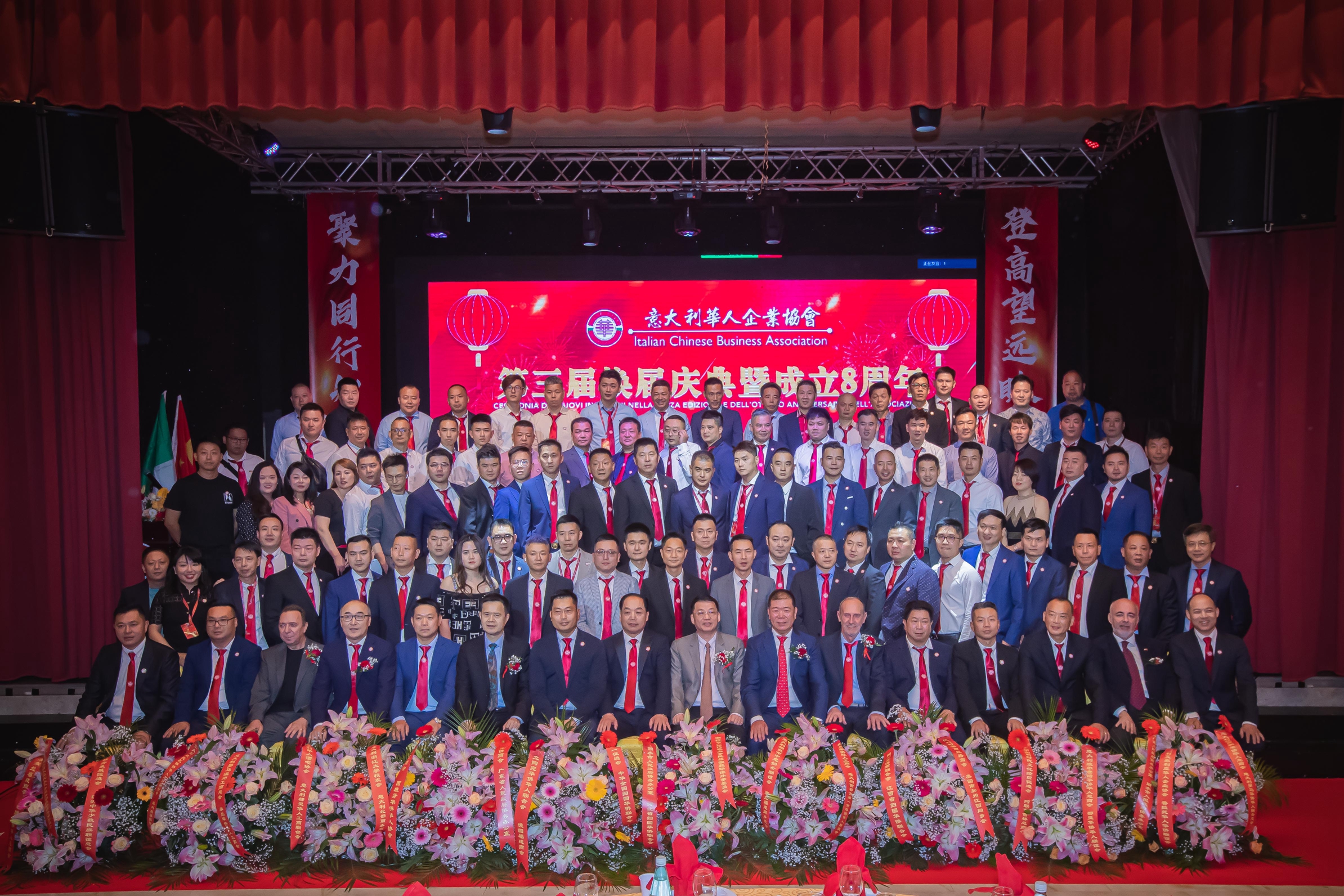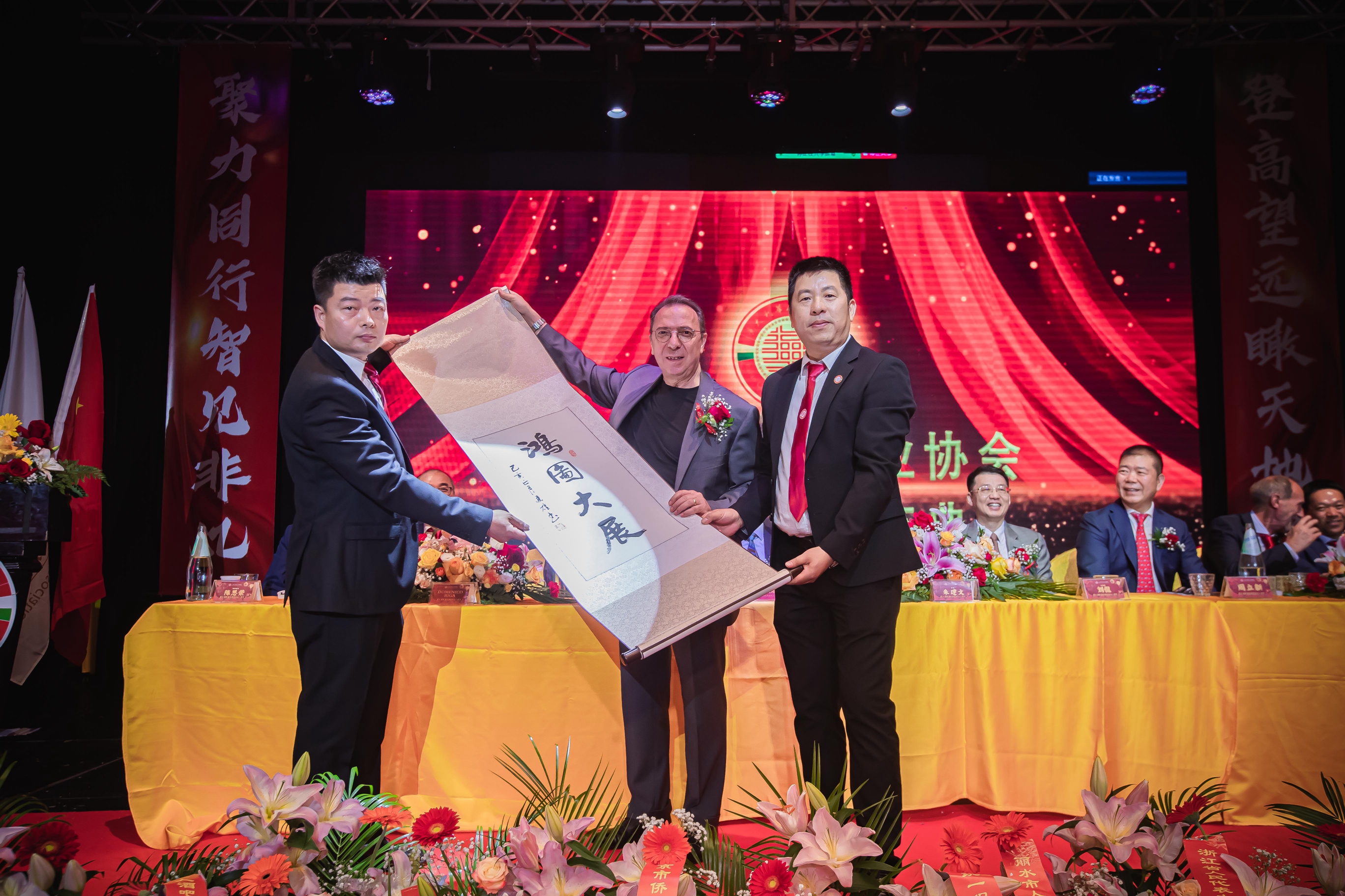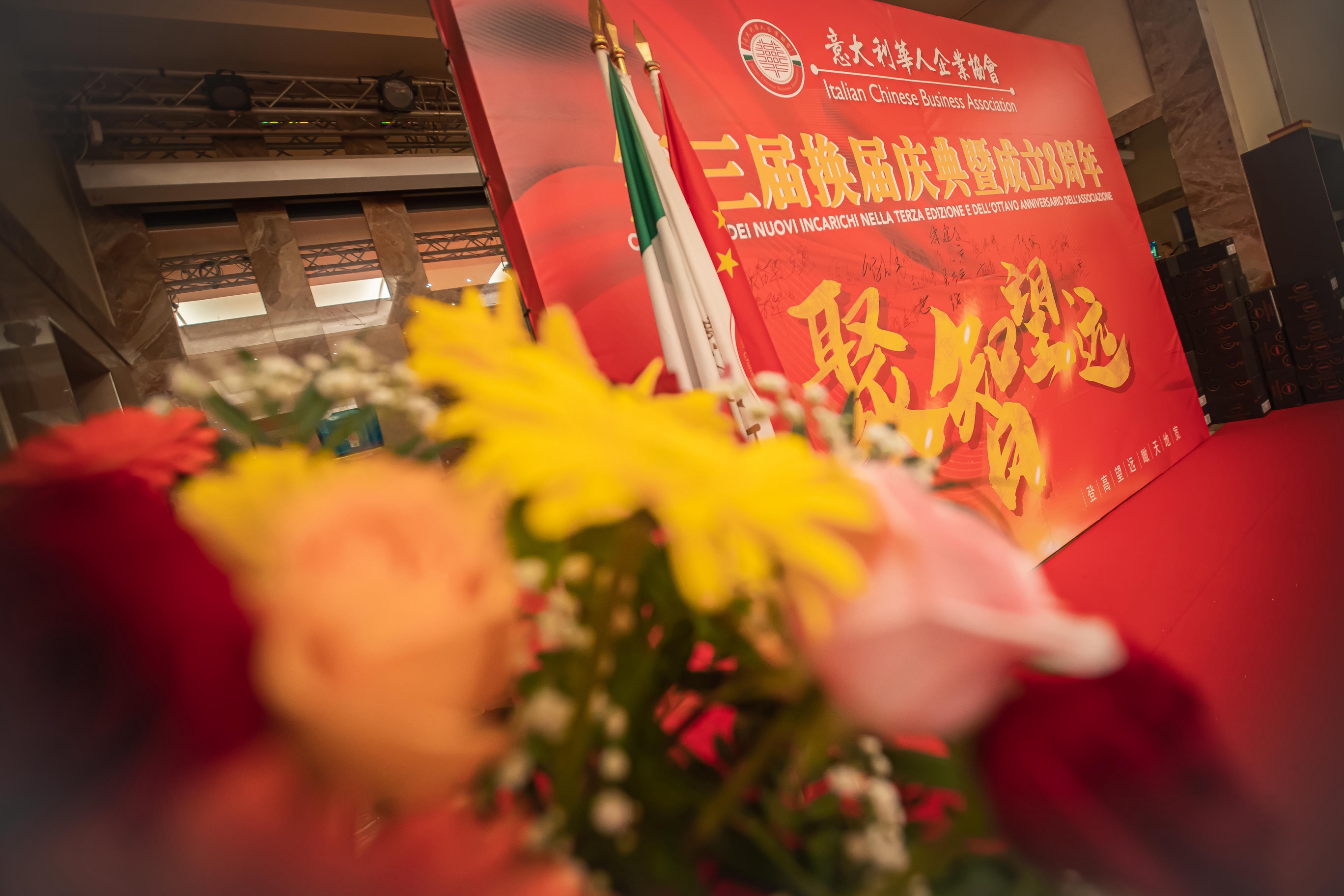大会主席台前摆放着中国有关部门、世界各地华人社团送来的花篮;主席台两侧楹联写道:登高望远瞰天地宽、聚力同行智见非凡。这既是当晚大会的主题,也是意大利华人企业家们的真实写照。