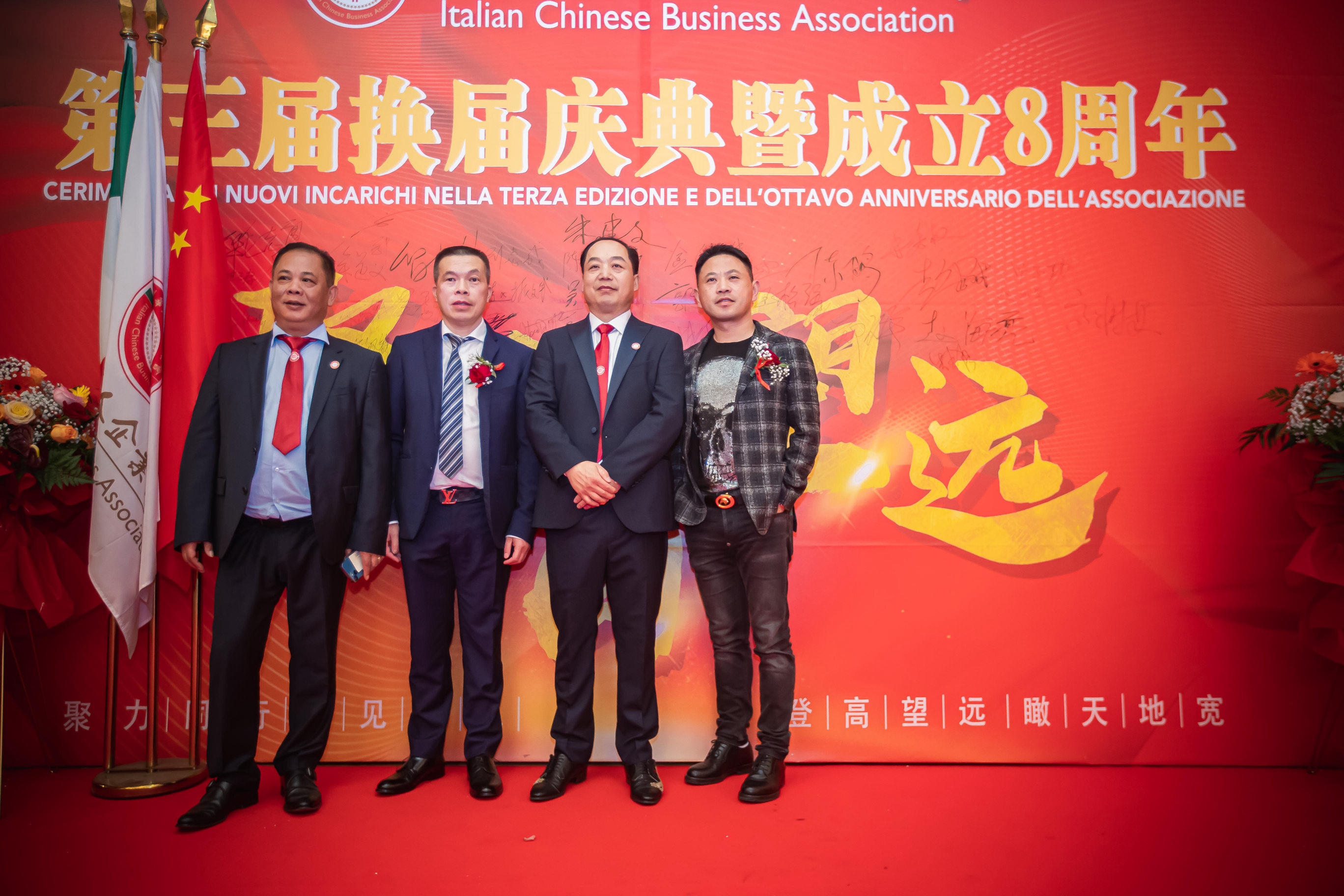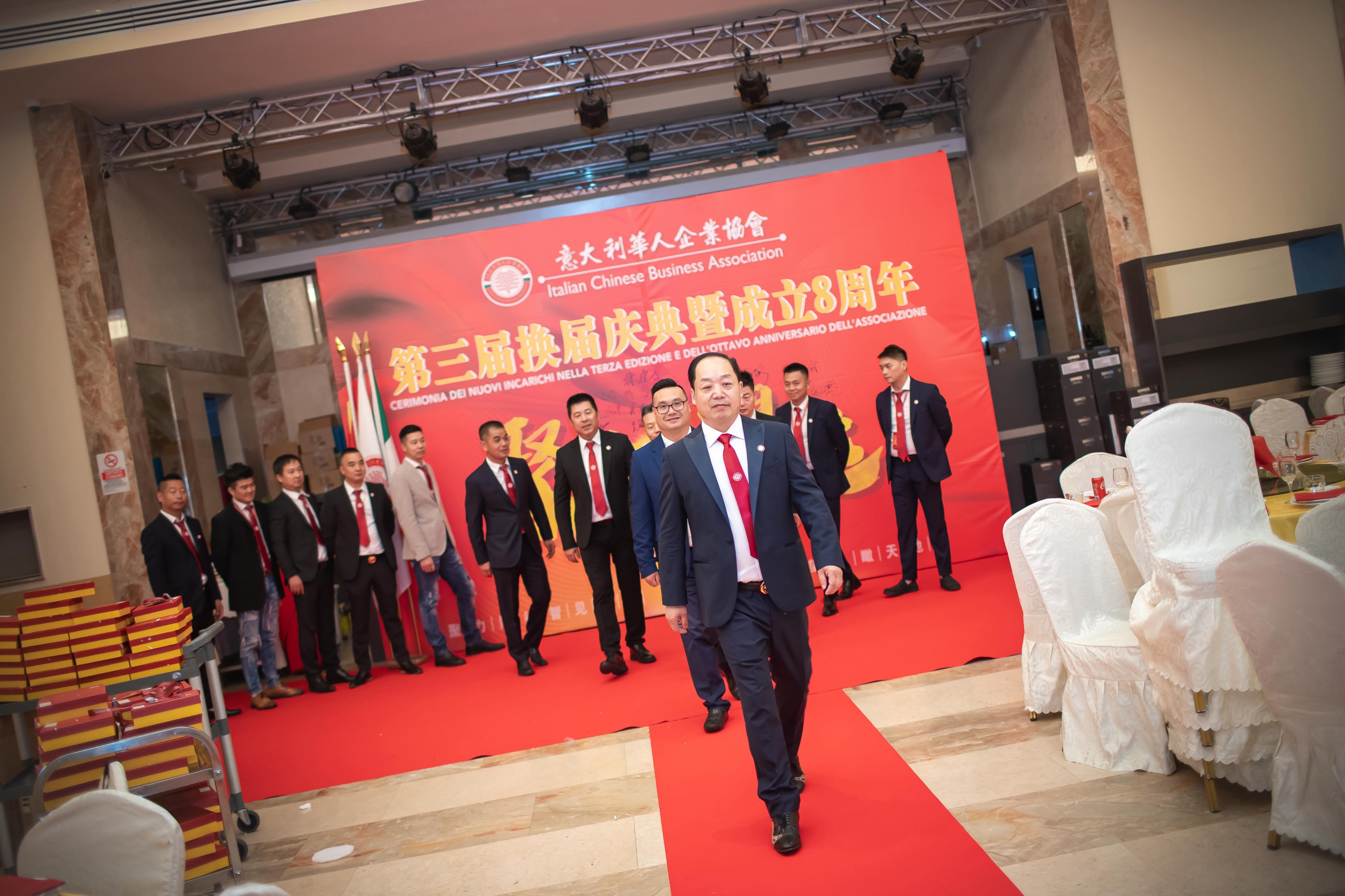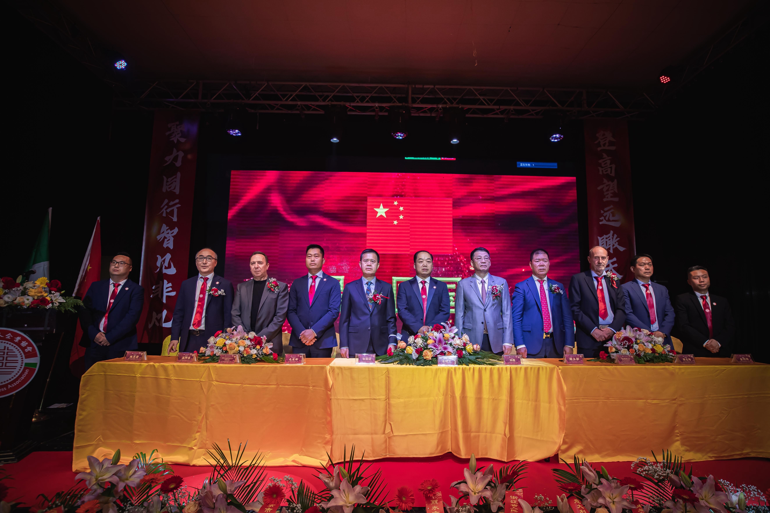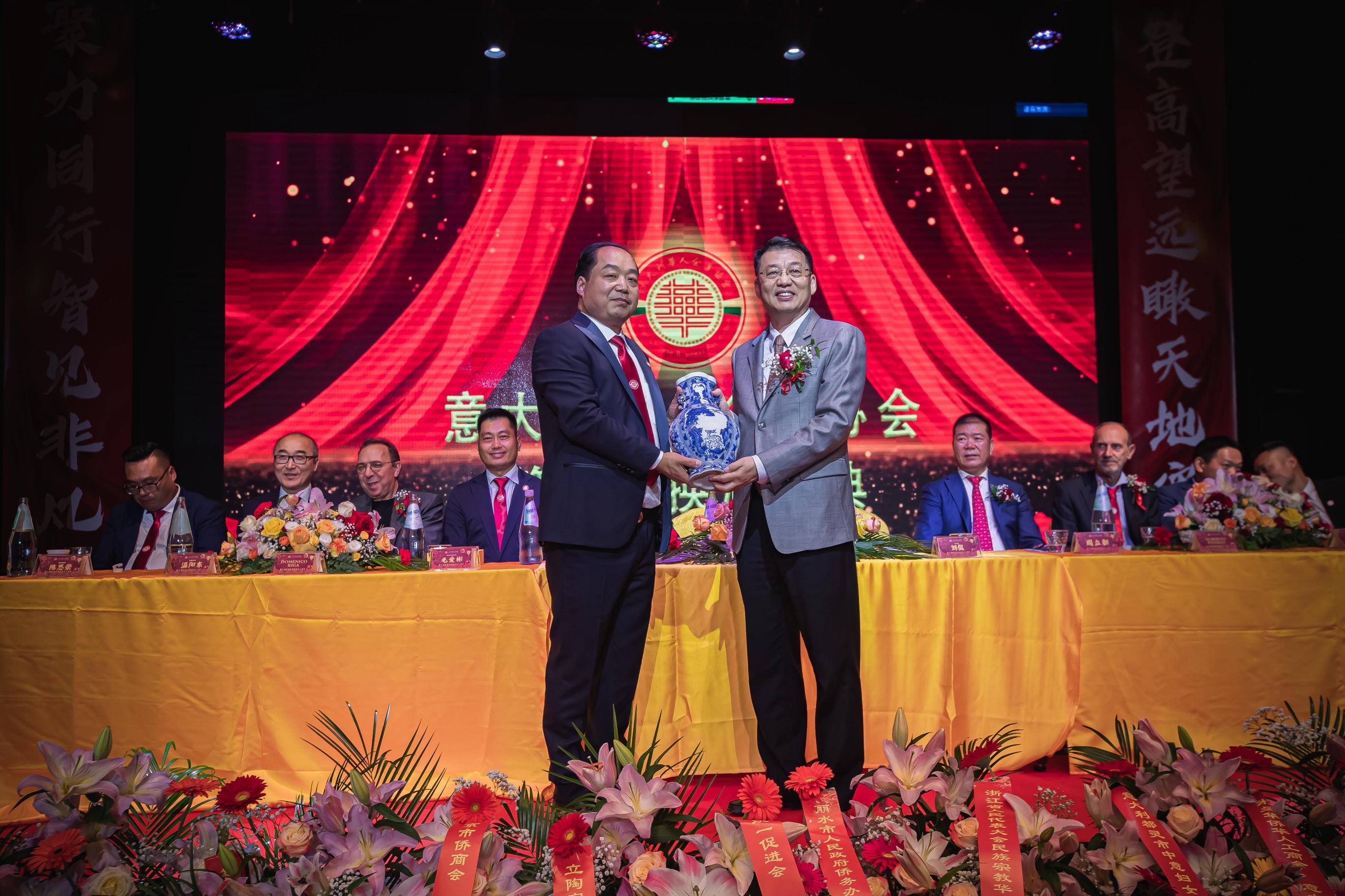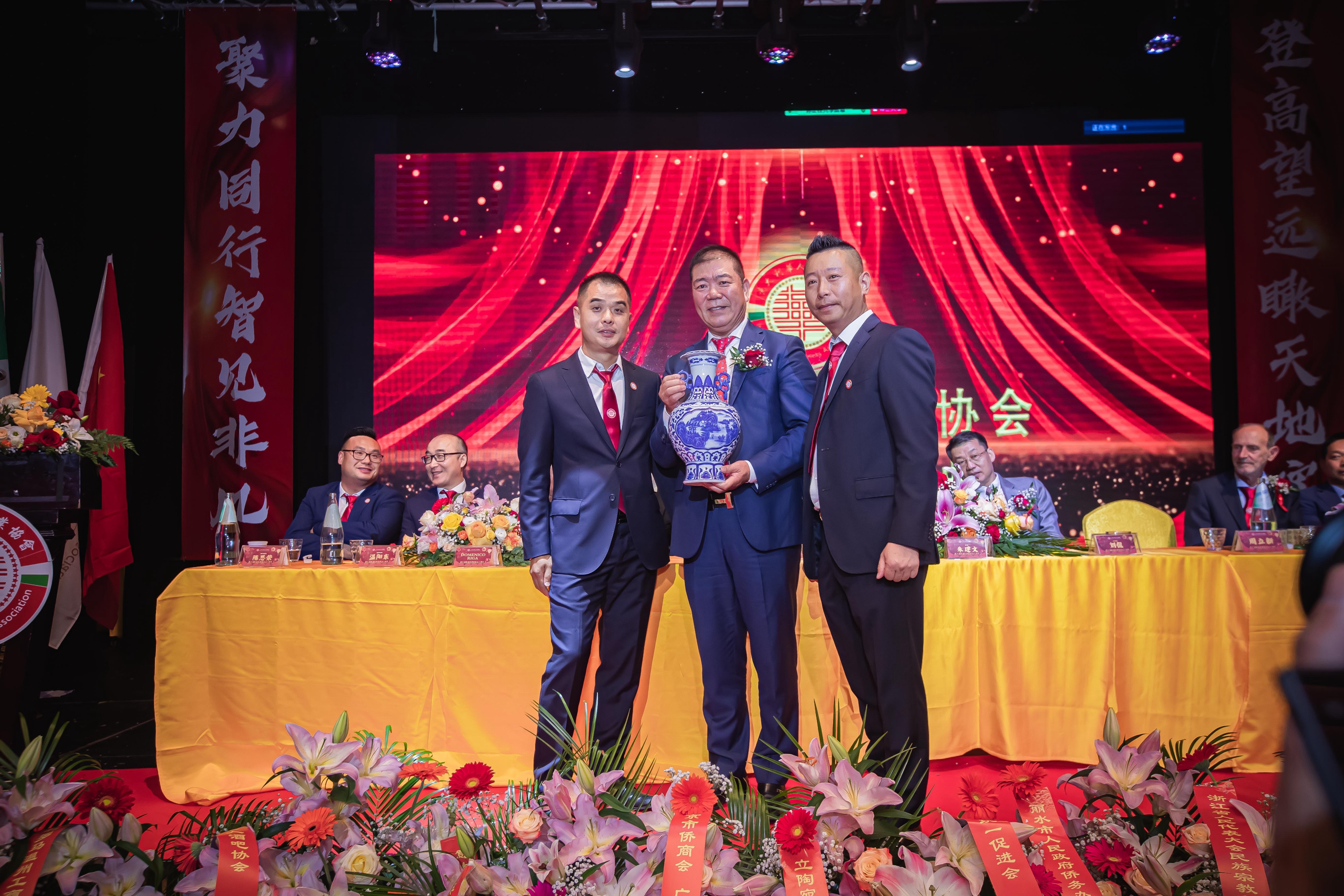 大会主席台前摆放着中国有关部门、世界各地华人社团送来的花篮;主席台两侧楹联写道:登高望远瞰天地宽、聚力同行智见非凡。这既是当晚大会的主题,也是意大利华人企业家们的真实写照。