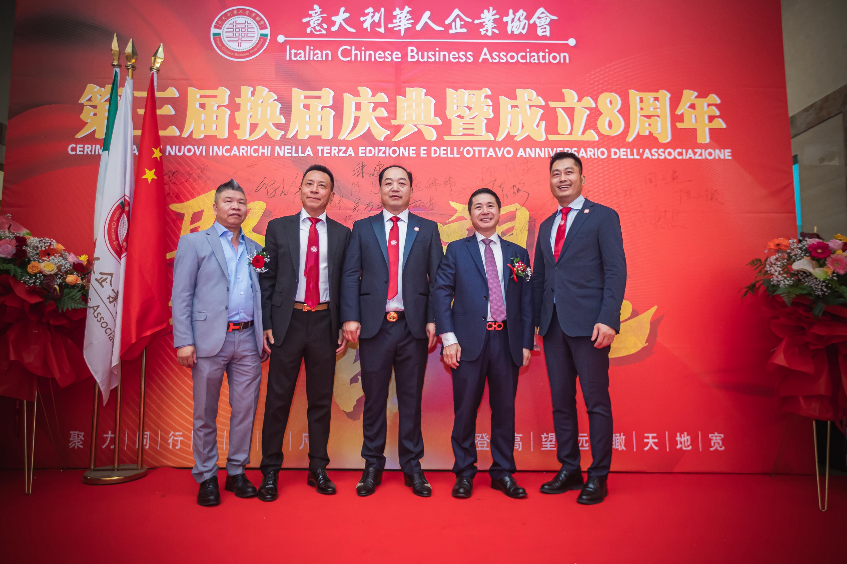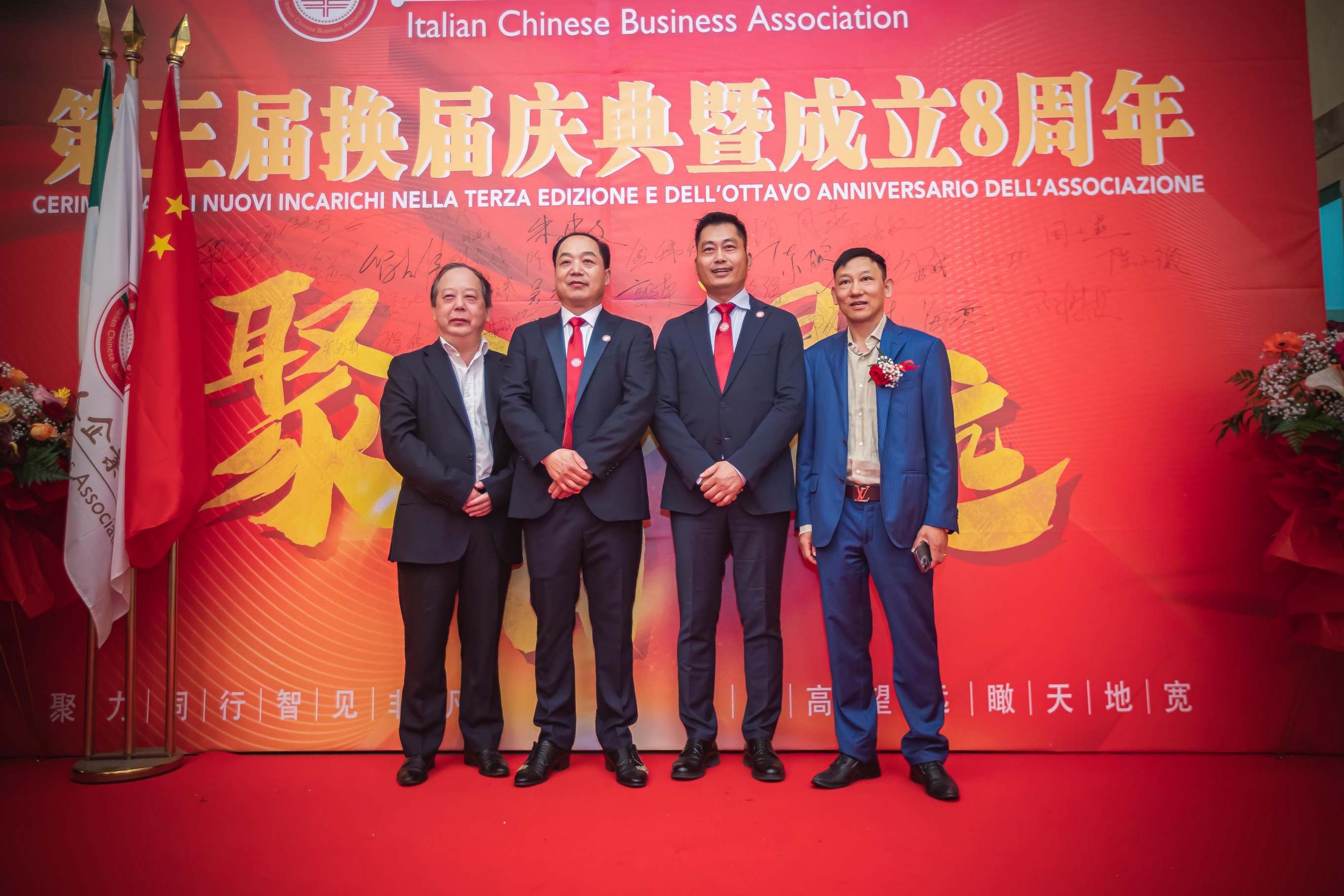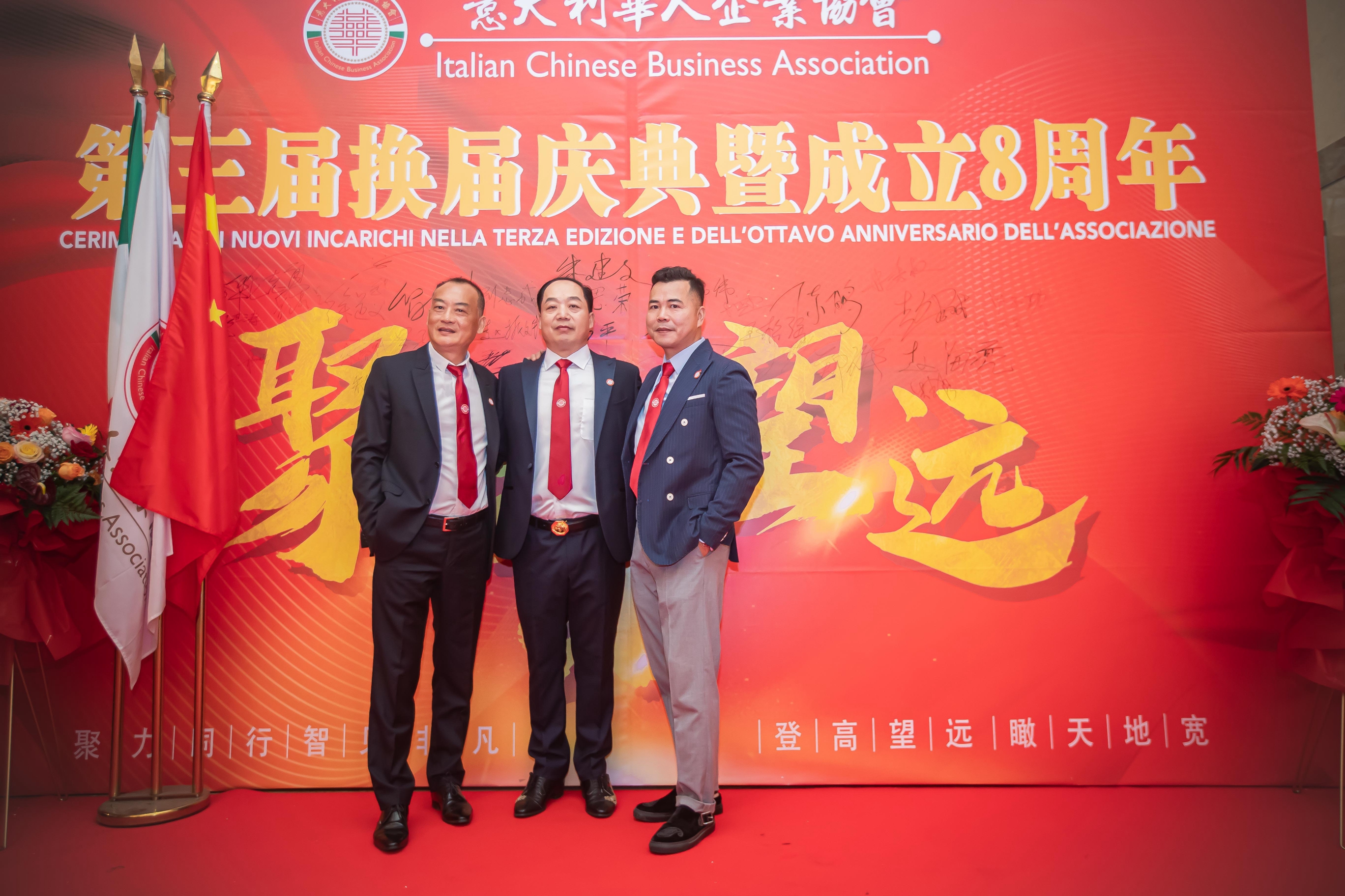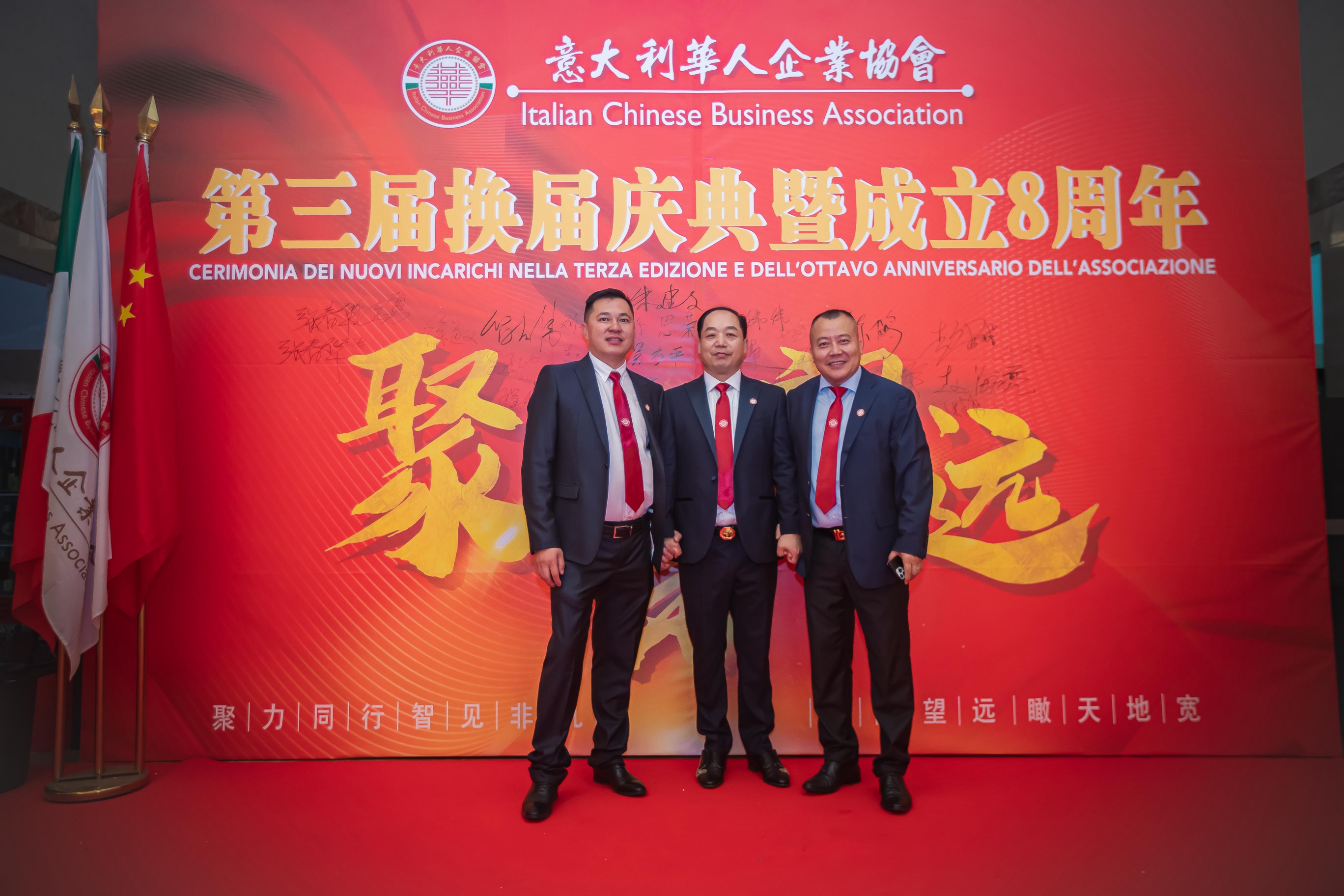 大会主席台前摆放着中国有关部门、世界各地华人社团送来的花篮;主席台两侧楹联写道:登高望远瞰天地宽、聚力同行智见非凡。这既是当晚大会的主题,也是意大利华人企业家们的真实写照。