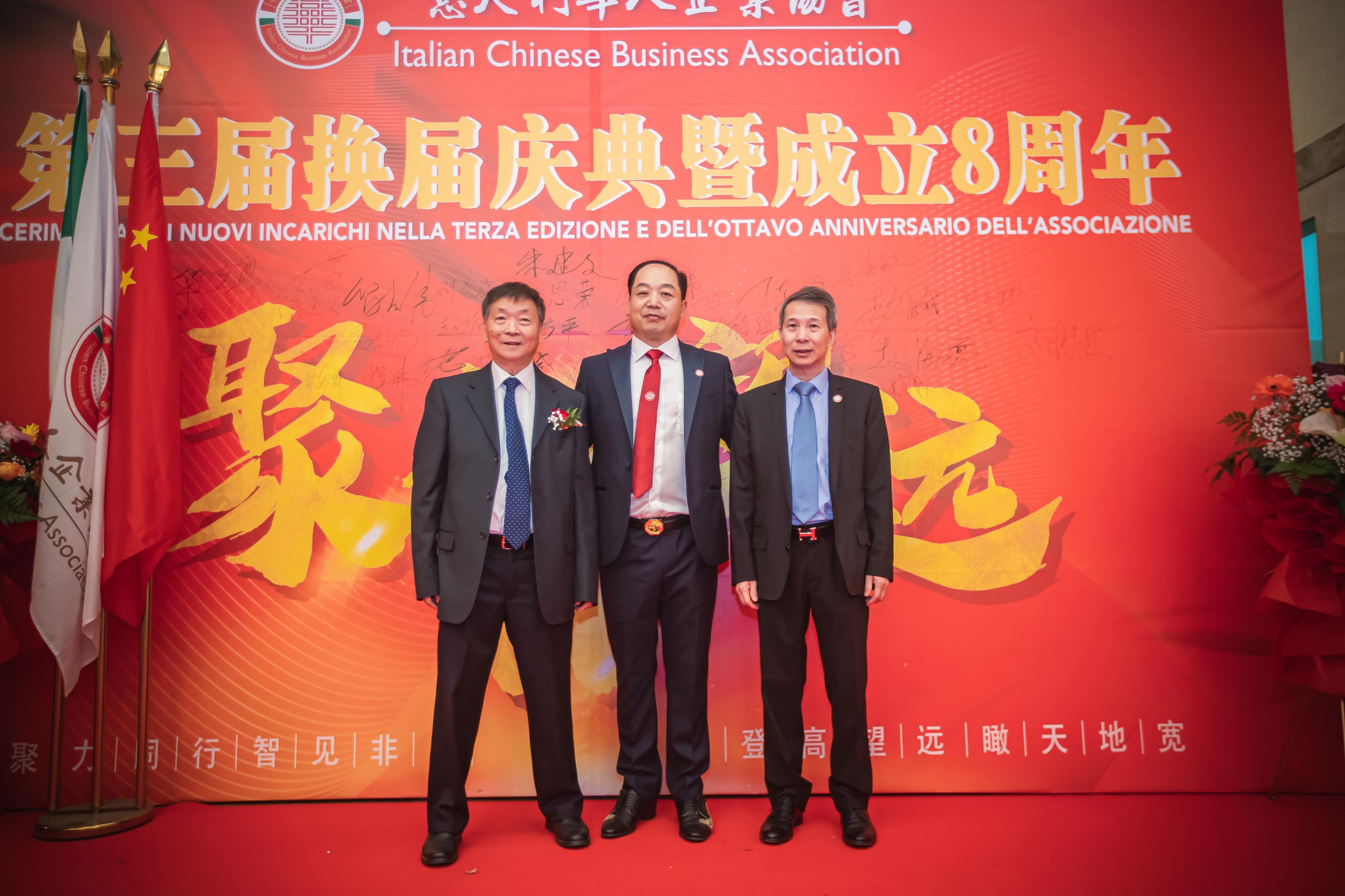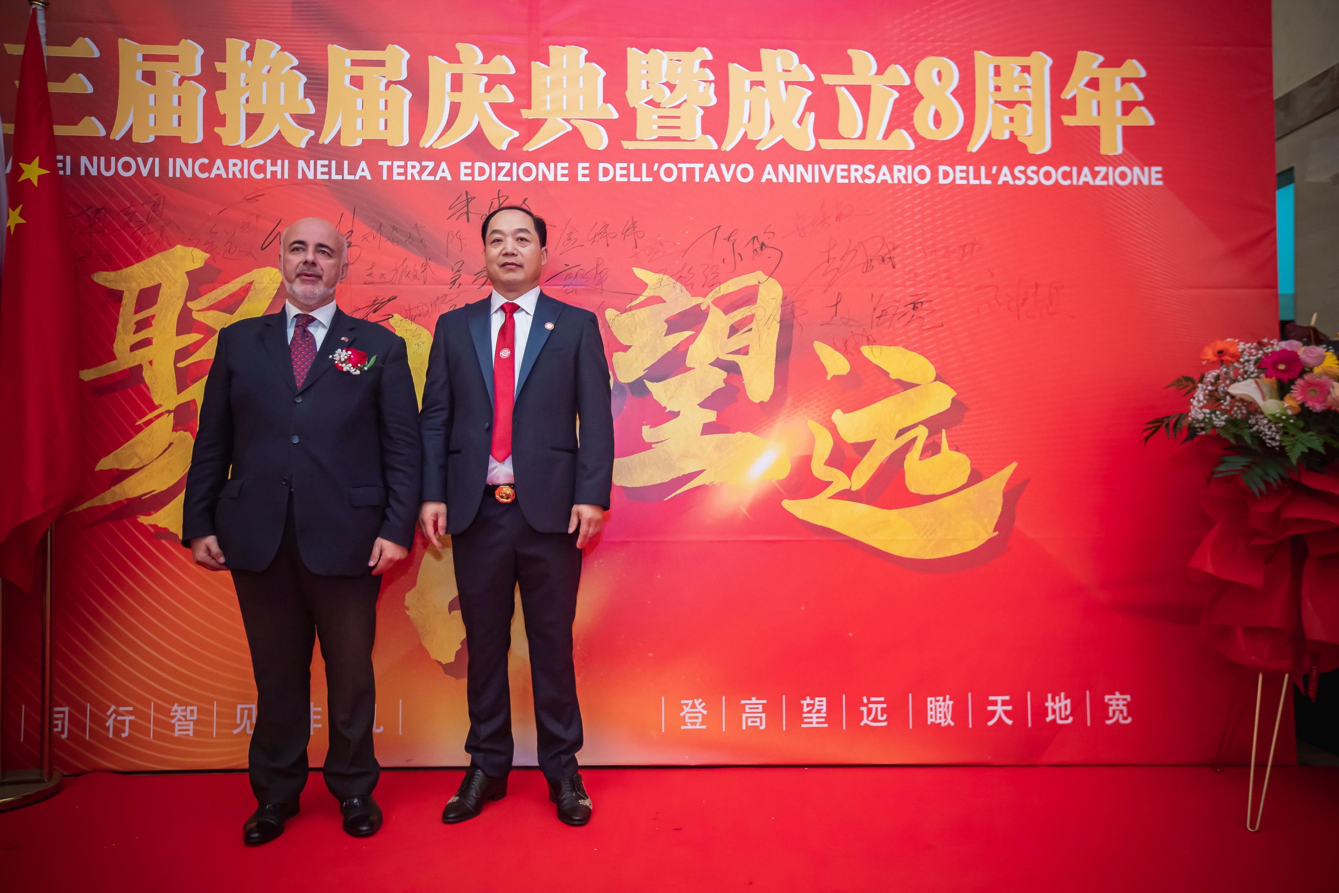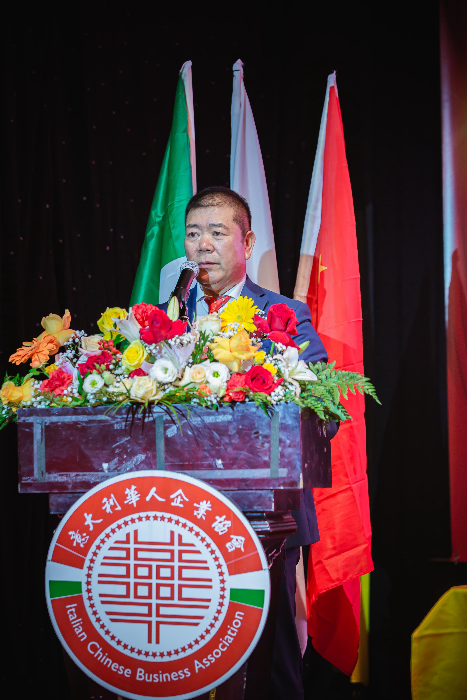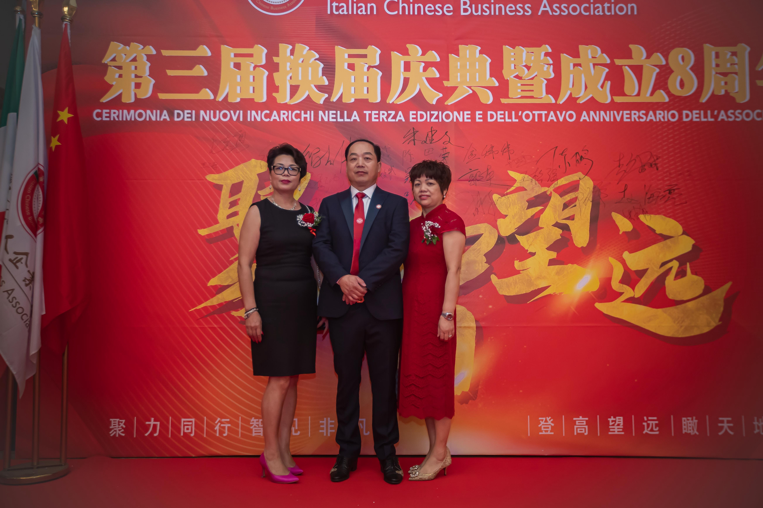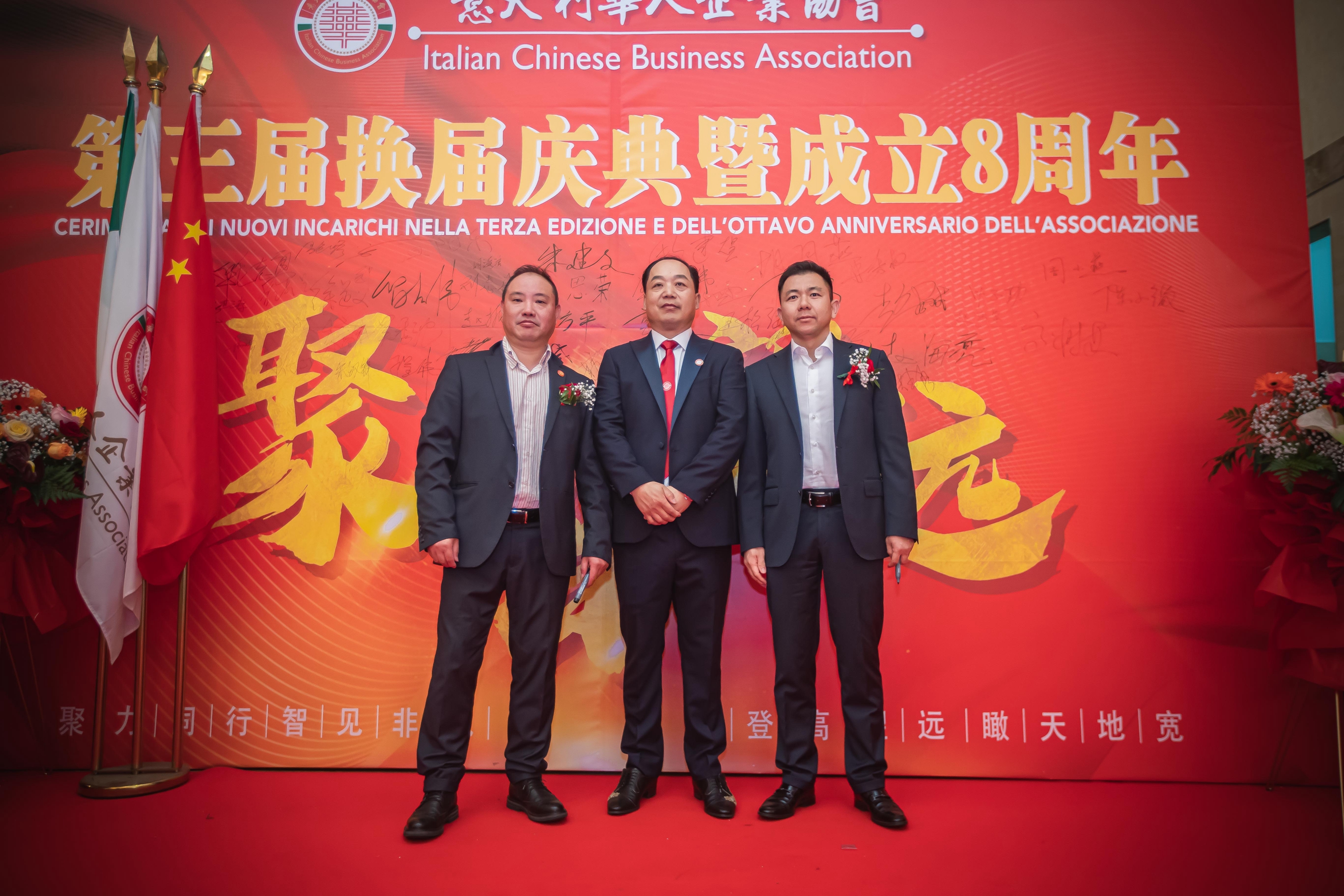 大会主席台前摆放着中国有关部门、世界各地华人社团送来的花篮;主席台两侧楹联写道:登高望远瞰天地宽、聚力同行智见非凡。这既是当晚大会的主题,也是意大利华人企业家们的真实写照。