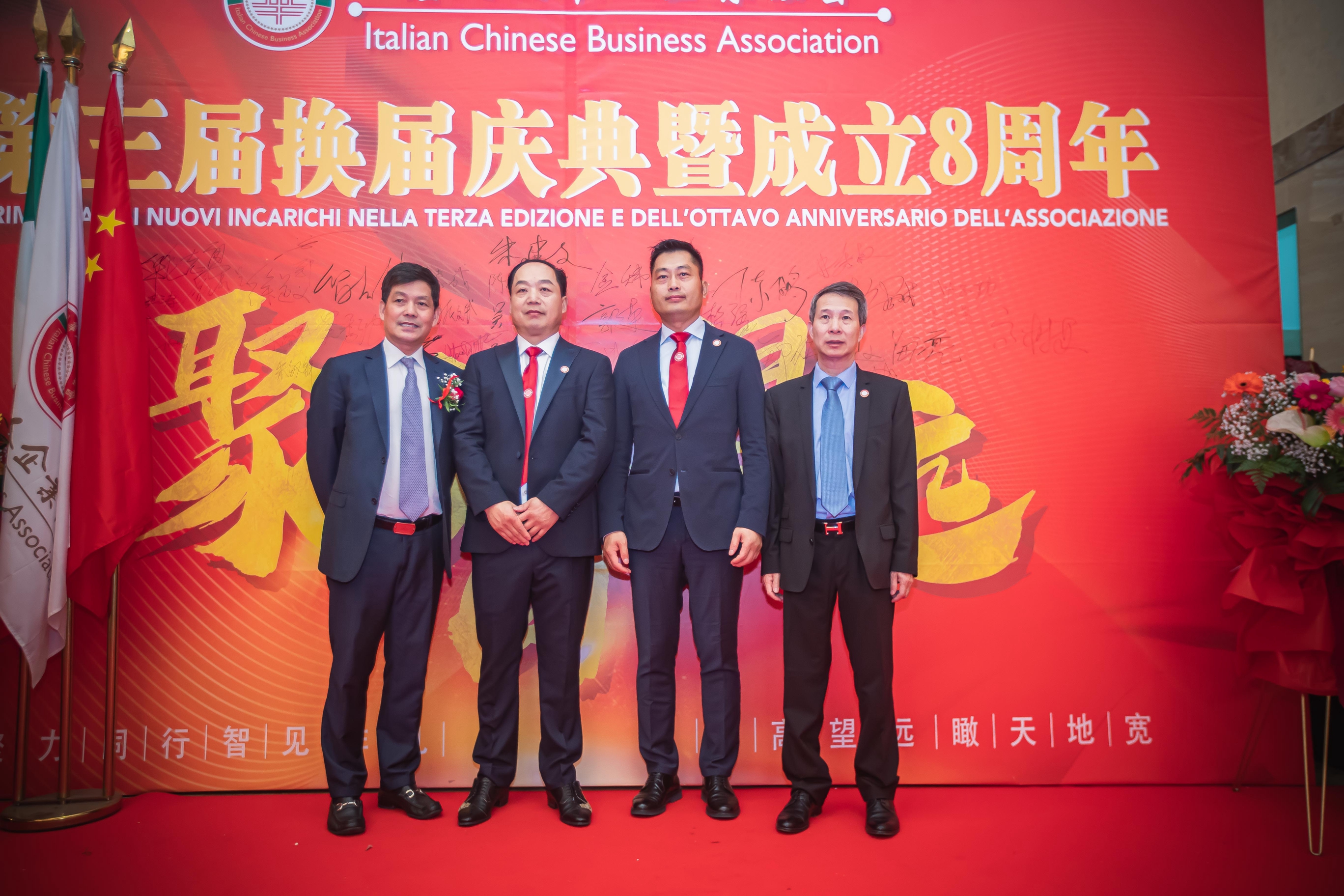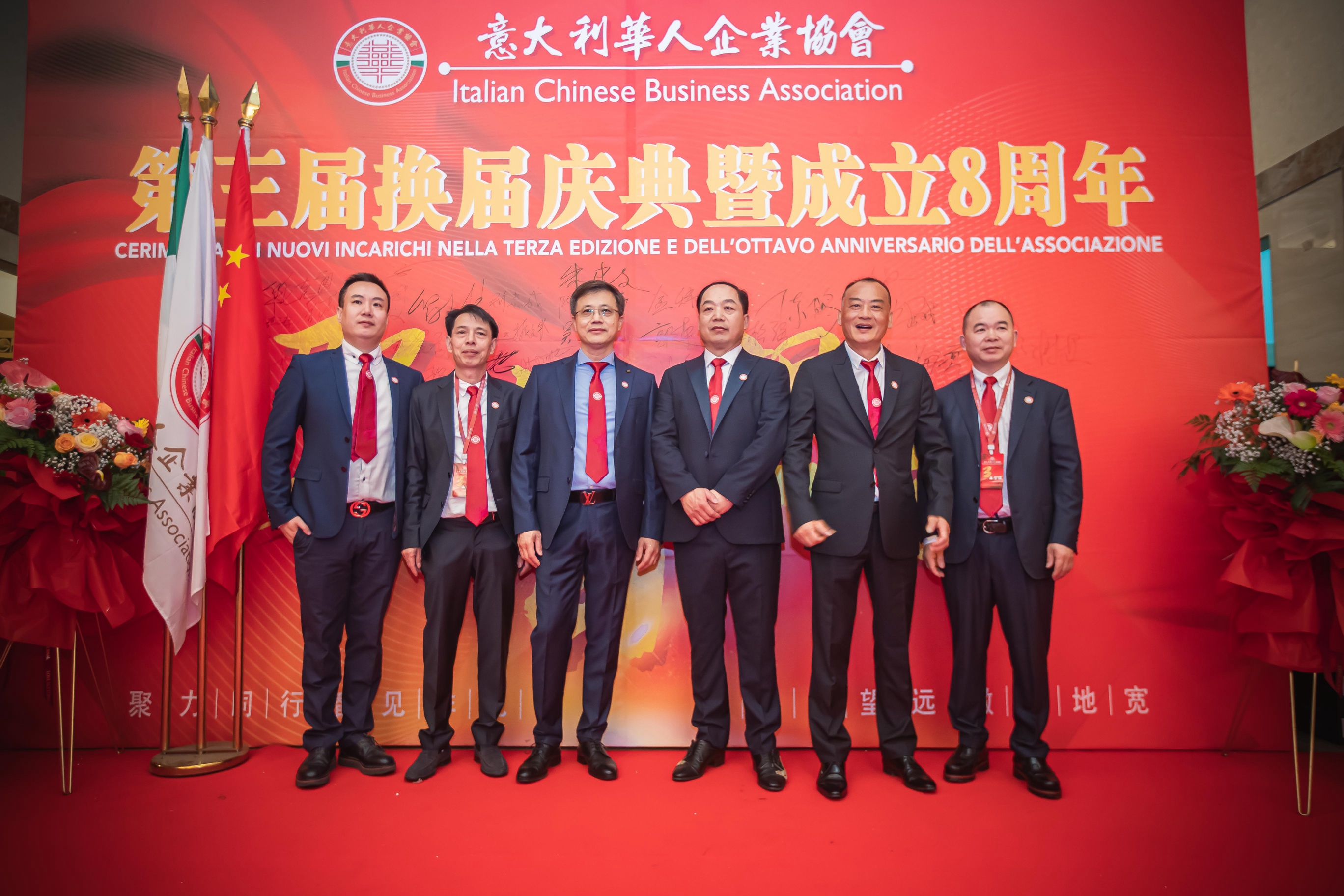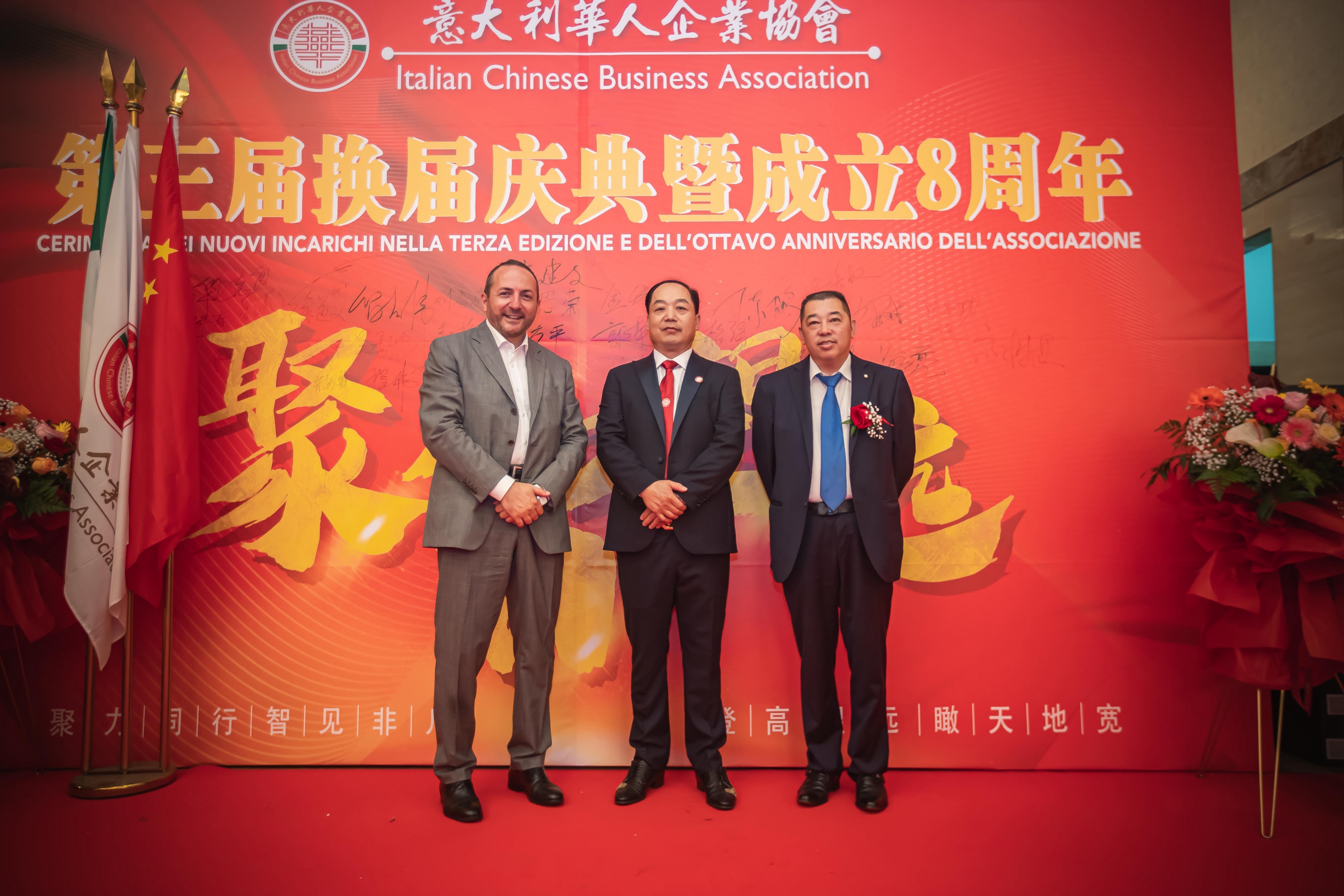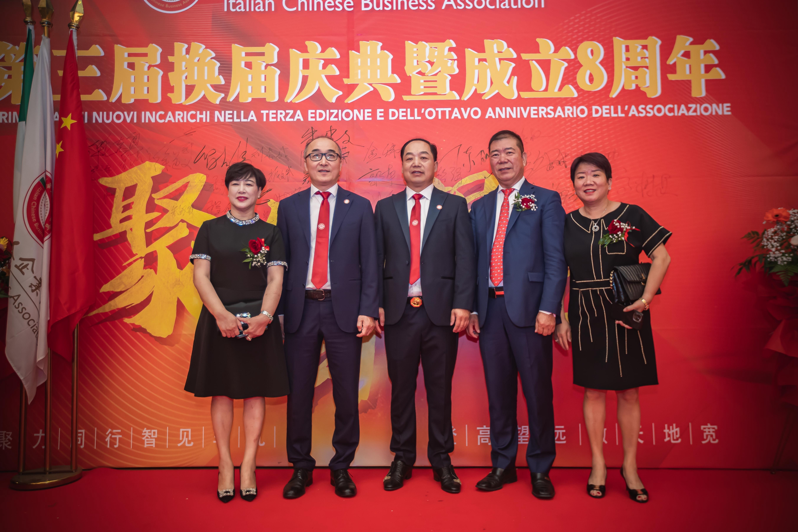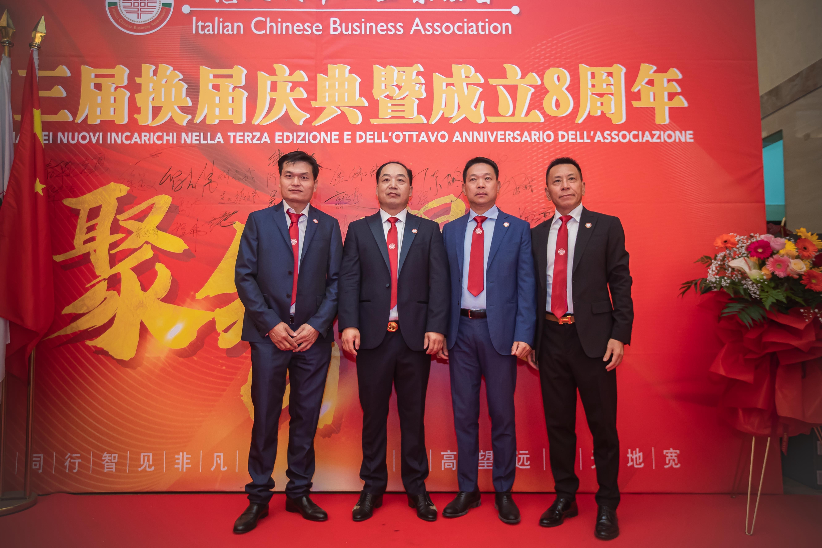大会主席台前摆放着中国有关部门、世界各地华人社团送来的花篮;主席台两侧楹联写道:登高望远瞰天地宽、聚力同行智见非凡。这既是当晚大会的主题,也是意大利华人企业家们的真实写照。
