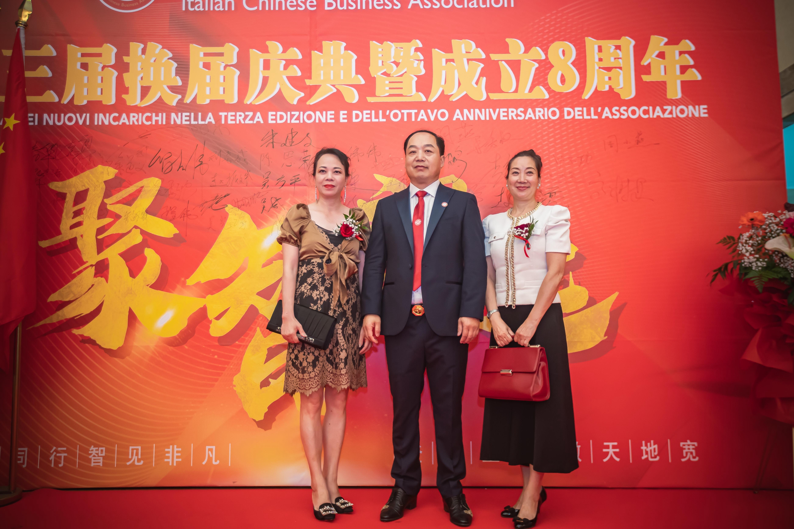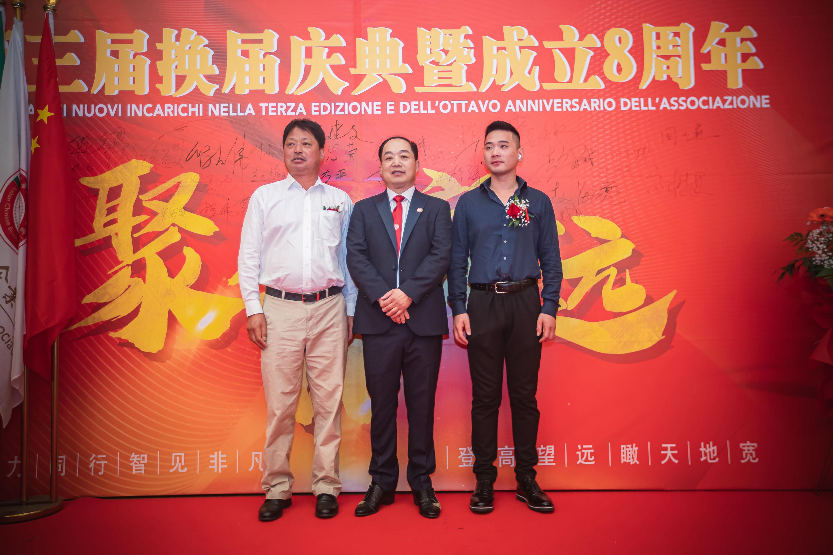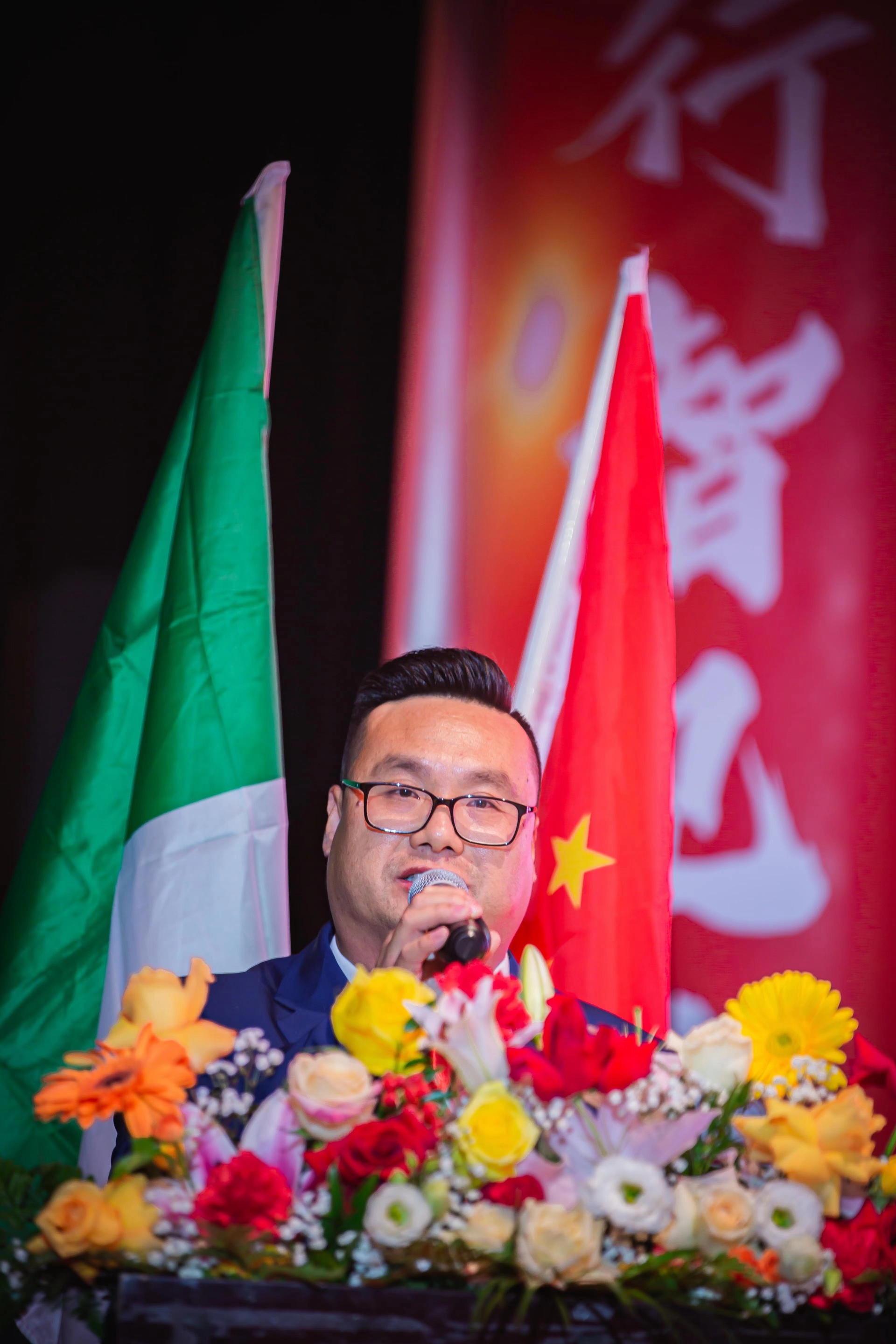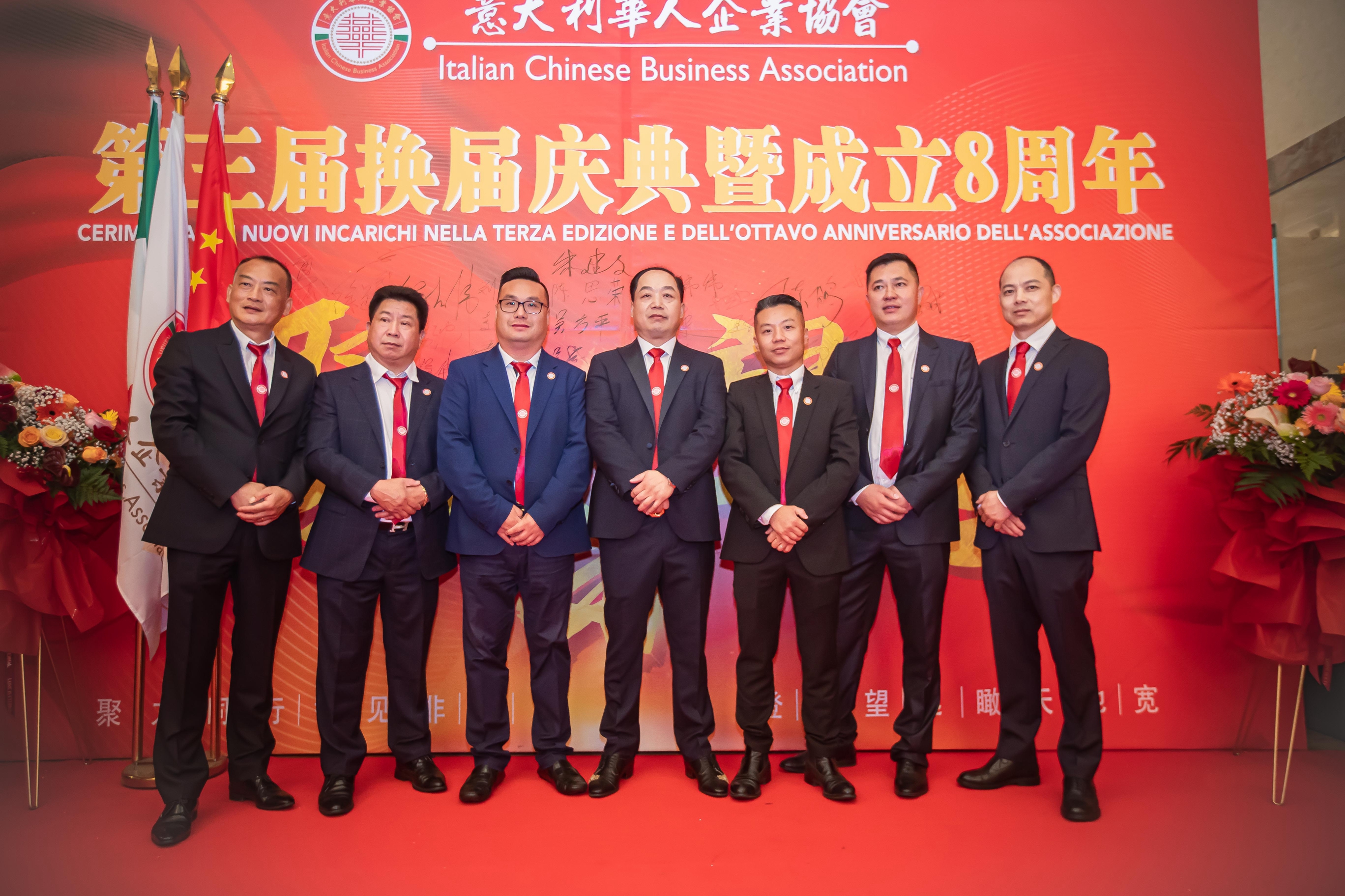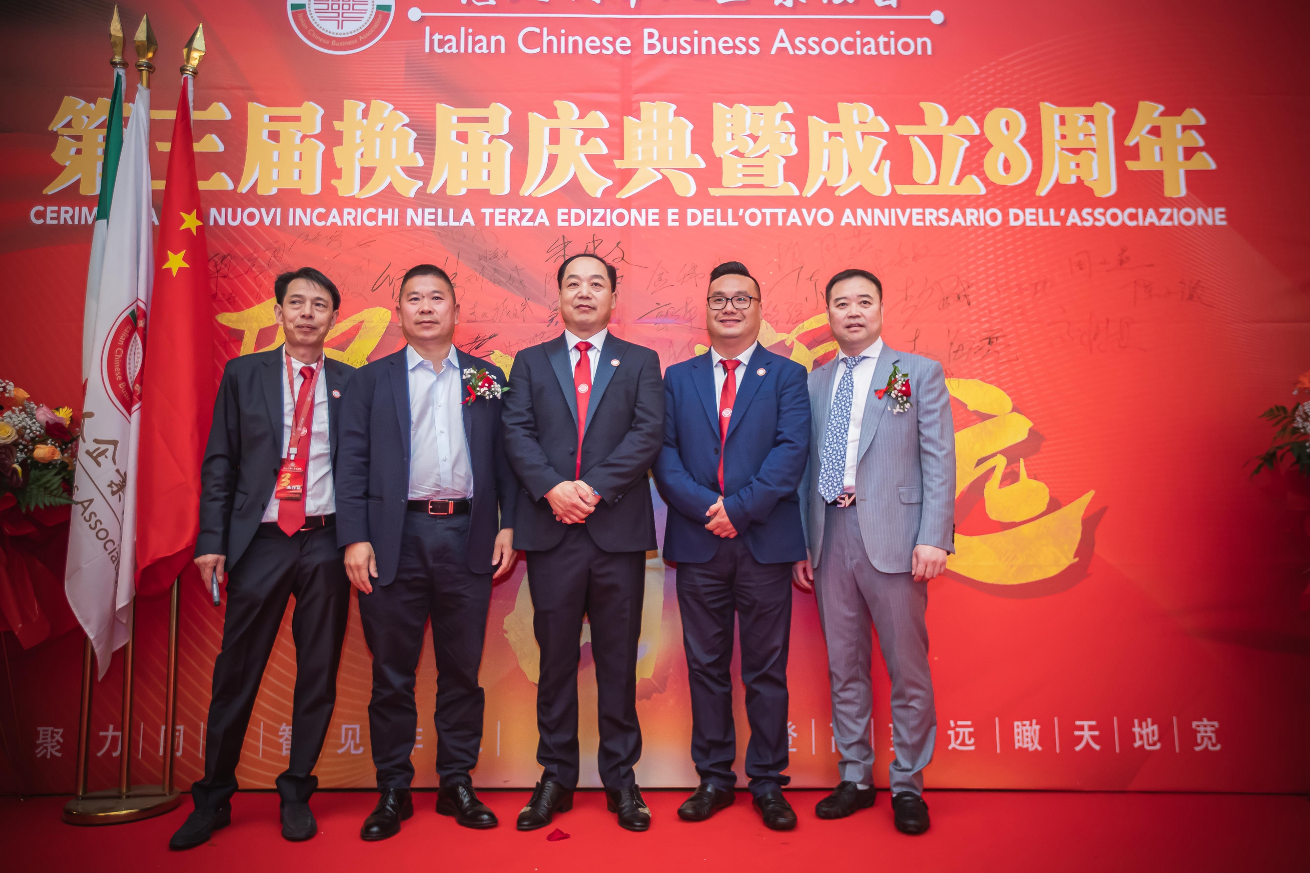 大会主席台前摆放着中国有关部门、世界各地华人社团送来的花篮;主席台两侧楹联写道:登高望远瞰天地宽、聚力同行智见非凡。这既是当晚大会的主题,也是意大利华人企业家们的真实写照。