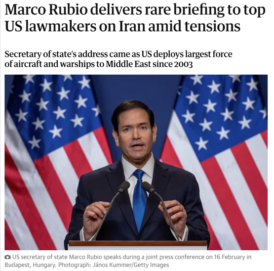 △《卫报》报道,鲁比奥罕见地向美国高级议员们,即“八人帮”,通报伊朗局势。