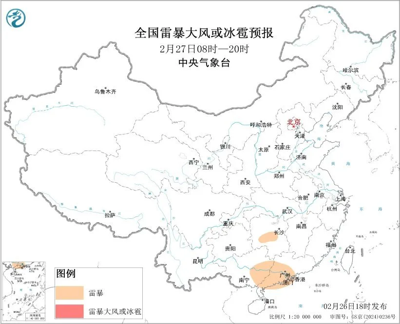 预计2月26日20时至27日20时,湖南西南部、江西南部、福建西部、贵州东南部、广西东部、广东中部等地的部分地区将有短时强降水天气,小时雨量20-30毫米,局地可达30毫米以上;另外,湖南中南部、江西中南部、福建西南部、贵州中东部、广西东部、广东中西部等地的局地将有雷暴。
